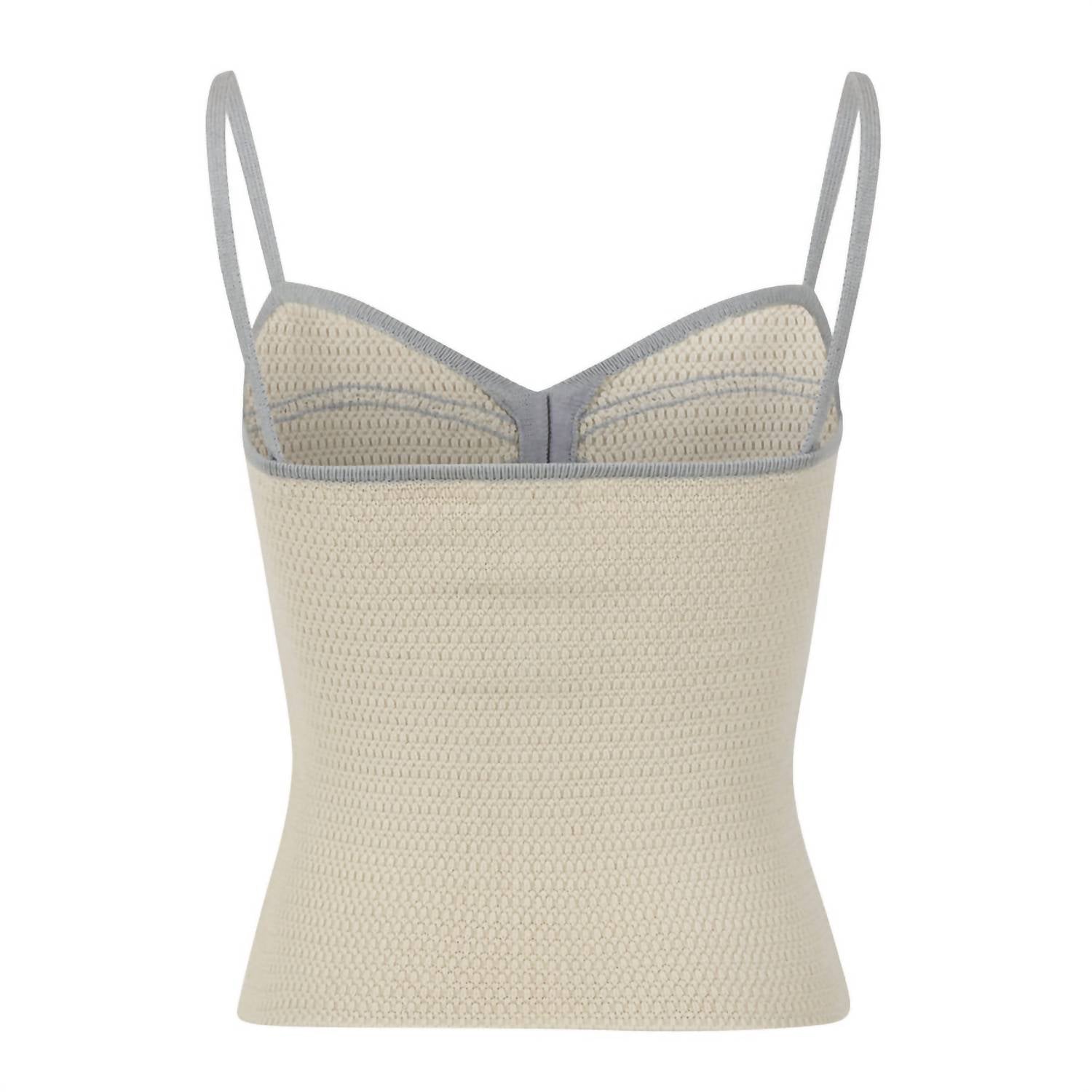 Introducing the Romi Sweater Tank by OSIS, a women's sleeveless top perfect for summer vacations. Crafted from a soft cotton blend, this tank features a textured pattern and a charming sweetheart neckline in a chic chalk color. Designed without pockets or closures, it provides seamless comfort with a contrasting outline that enhances its allure. Trend: Y2K.