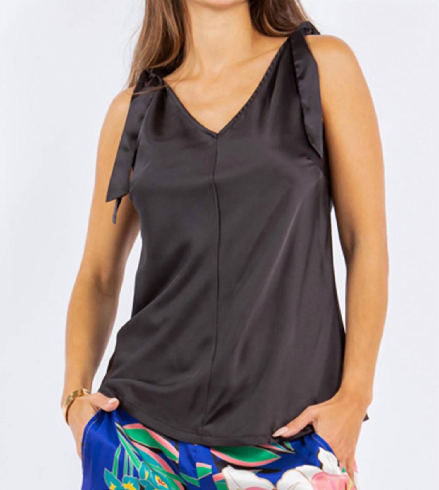 This classic tank top is perfect for layering and cute enough to wear on its own. Elevate your style with the Stretch Satin Solid Tie Shoulder Tank Top by Paparazzi, a sleek addition to your wardrobe. This sleeveless tank features luxurious satin material in a bold black solid pattern, perfect for a sophisticated look. Closure is a convenient pull-on design. Care: Machine wash cold on a gentle cycle, tumble dry low, and avoid bleach to maintain its elegance.