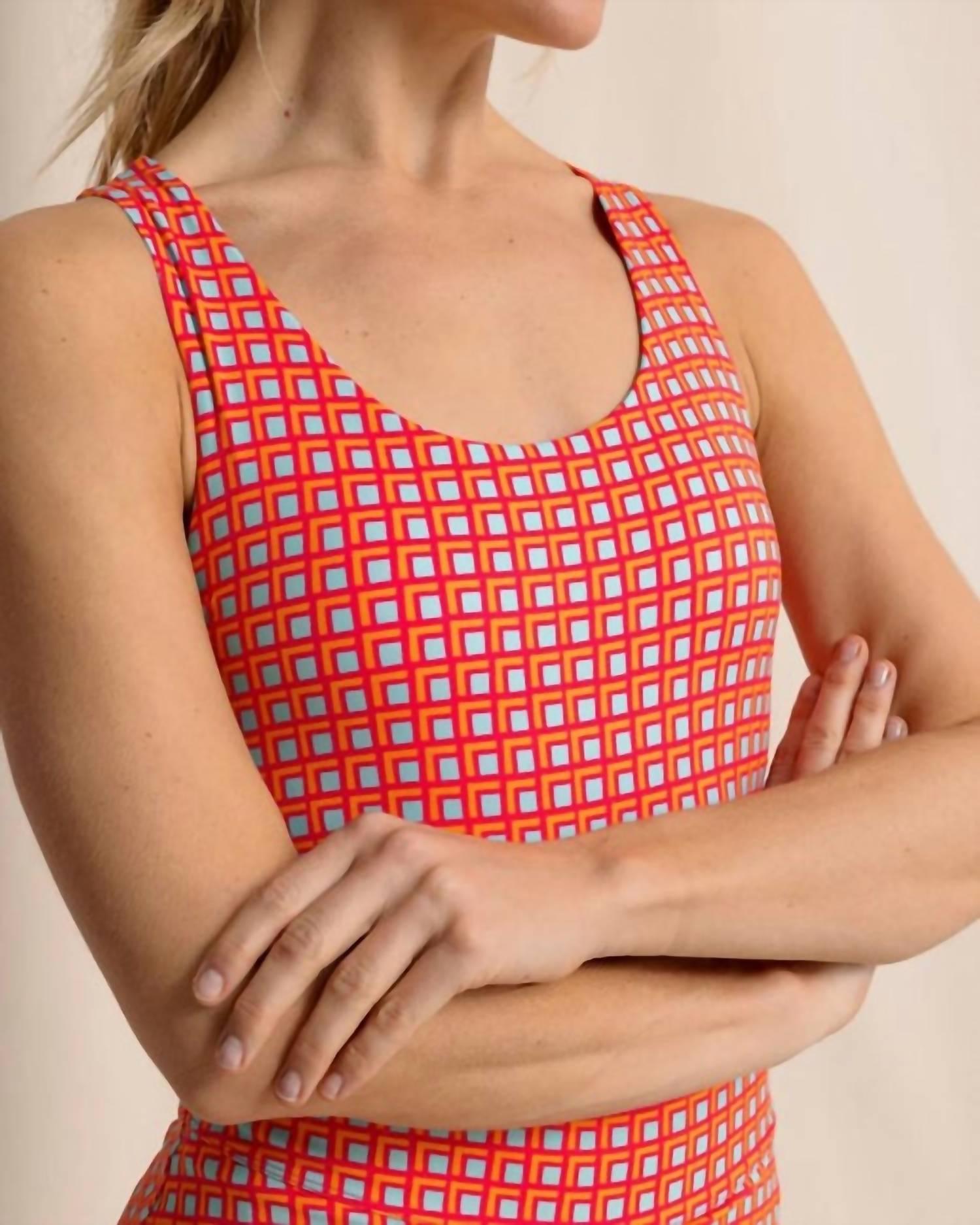 Fit, fabric and functionality. This tank top checks all the boxes. Showcase your style with the Natalie Printed Cross Back Tank. Patterned in Calypso Berry and equipped with removable cups and elastic straps, this tank stays cool and breathable thanks to its high-quality performance fabric blend. Stretch. Wicking. Cooling. UV Protection. Machine Wash The model is 5'10" and wearing an extra small size.