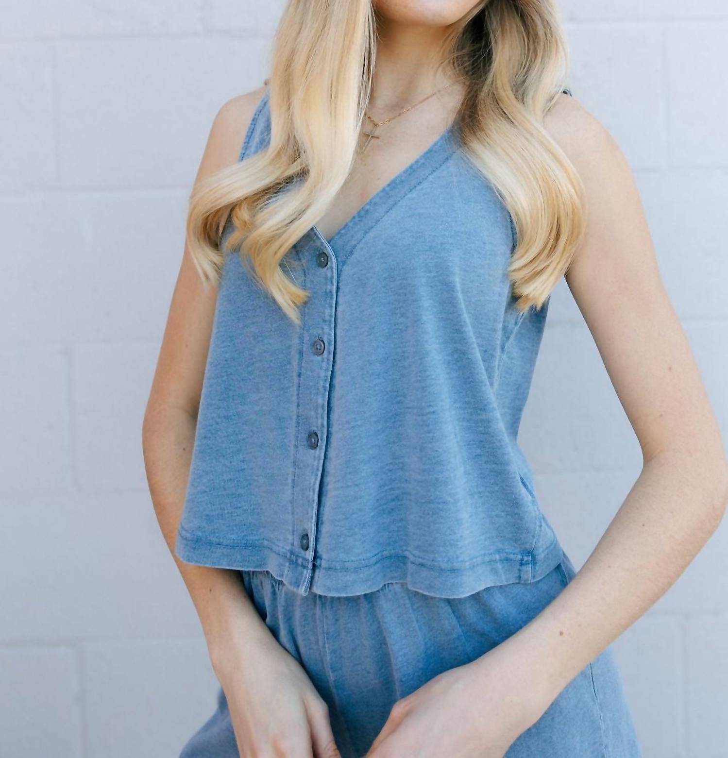 Fit, fabric and functionality. This tank top checks all the boxes. Elevate your wardrobe with the Solace Jersey Knit Denim Top by Z Supply in a chic Medium Indigo shade. This sleeveless tank features a relaxed fit and a v-neckline, crafted from 100% cotton for breathable comfort. The cropped length and wide straps are bra friendly, with a button front closure for effortless style. Care instructions: machine wash and tumble dry. Model is wearing a size XS with a garment length from shoulder at 19" and bust measurement of 34 1/2".