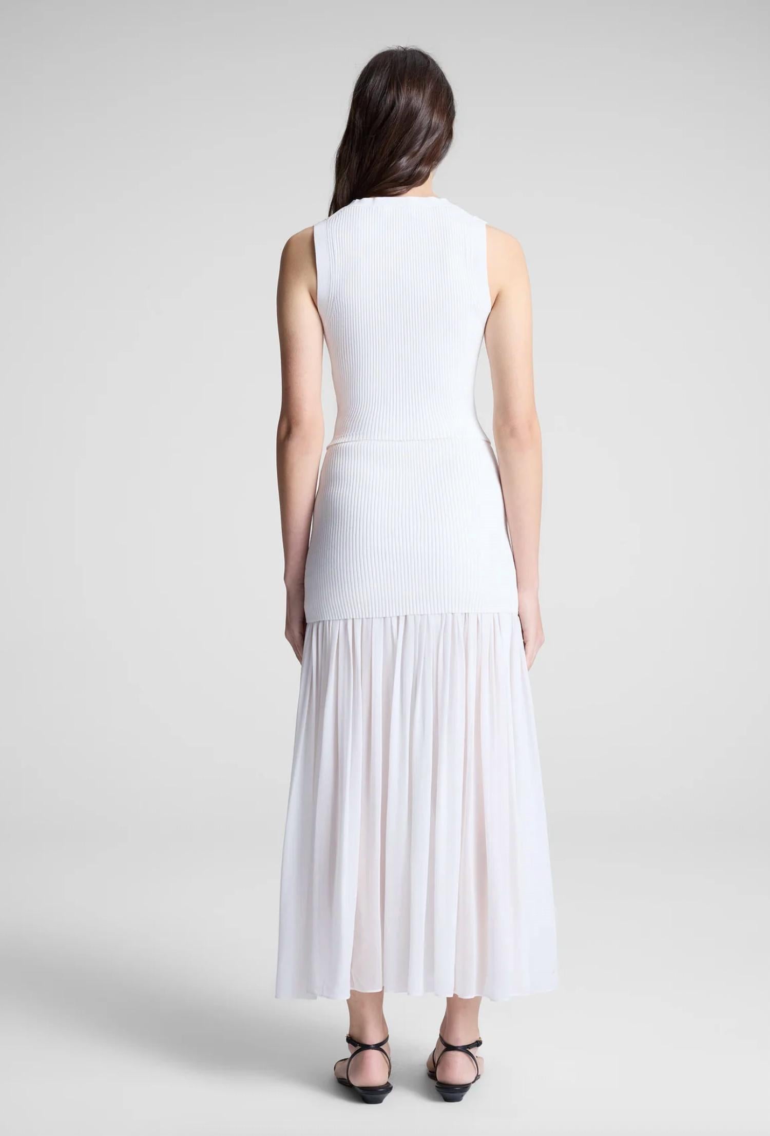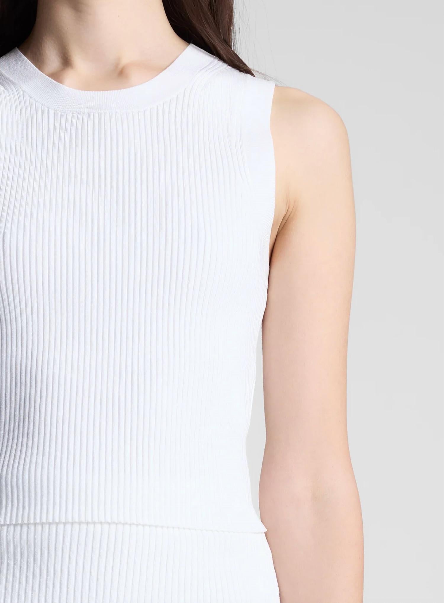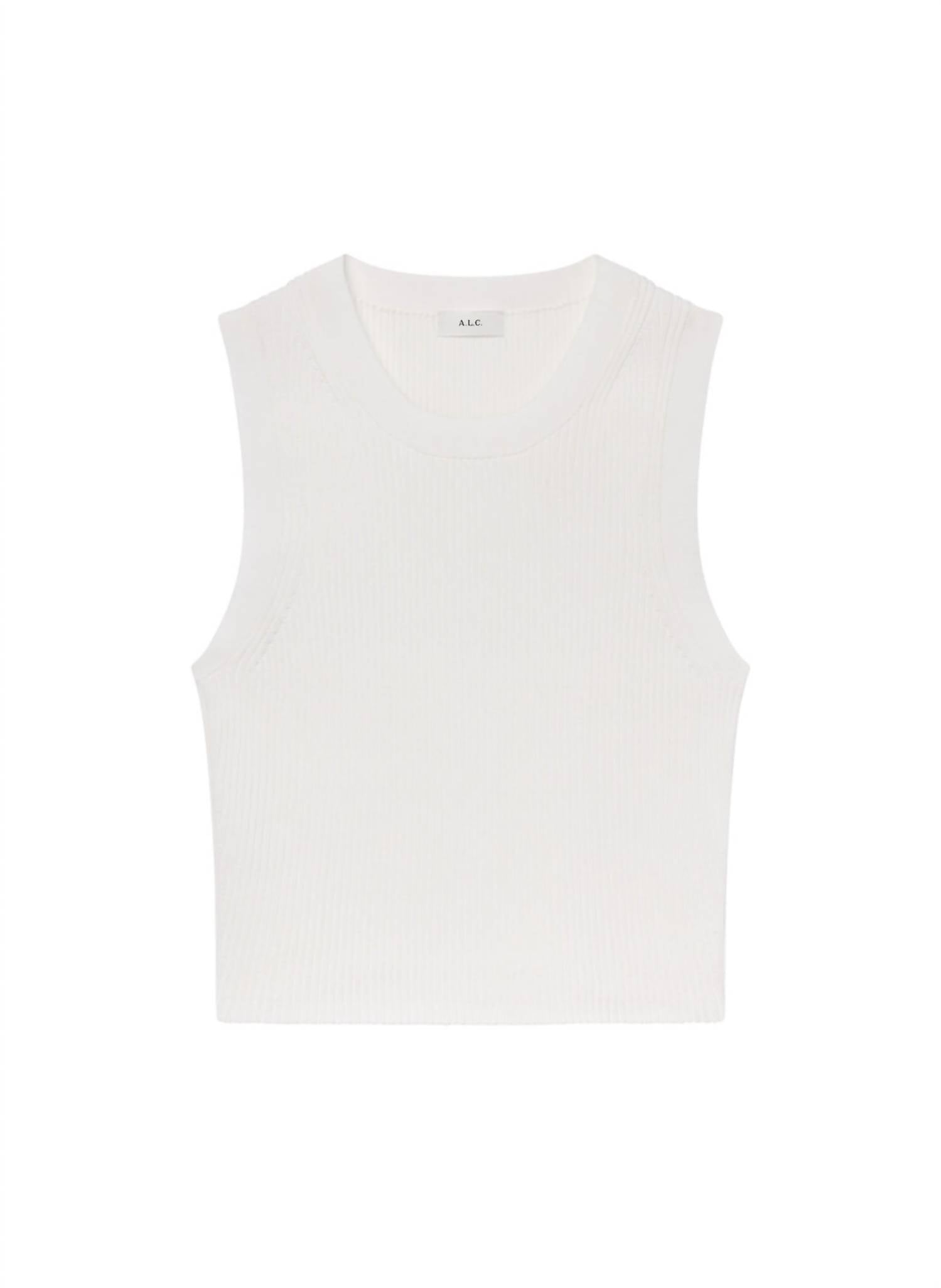 This classic tank top is perfect for layering and cute enough to wear on its own. Elevate your summer wardrobe with the A.L.C. Kayla Knit Top, a stylish addition in a beautifully textured pearl hue. This sleeveless tank presents a sleek ribbed texture crafted from 62% Rayon, 35% Nylon, and 3% Elastane, delivering a fitted silhouette that finishes at a length of 18.75 inches. Its pull-on design features a subtle variation in the crewneck and shoulder ribbing, ensuring a clean and minimalist finish. Care instructions are simple: hand wash cold and lay flat to dry.