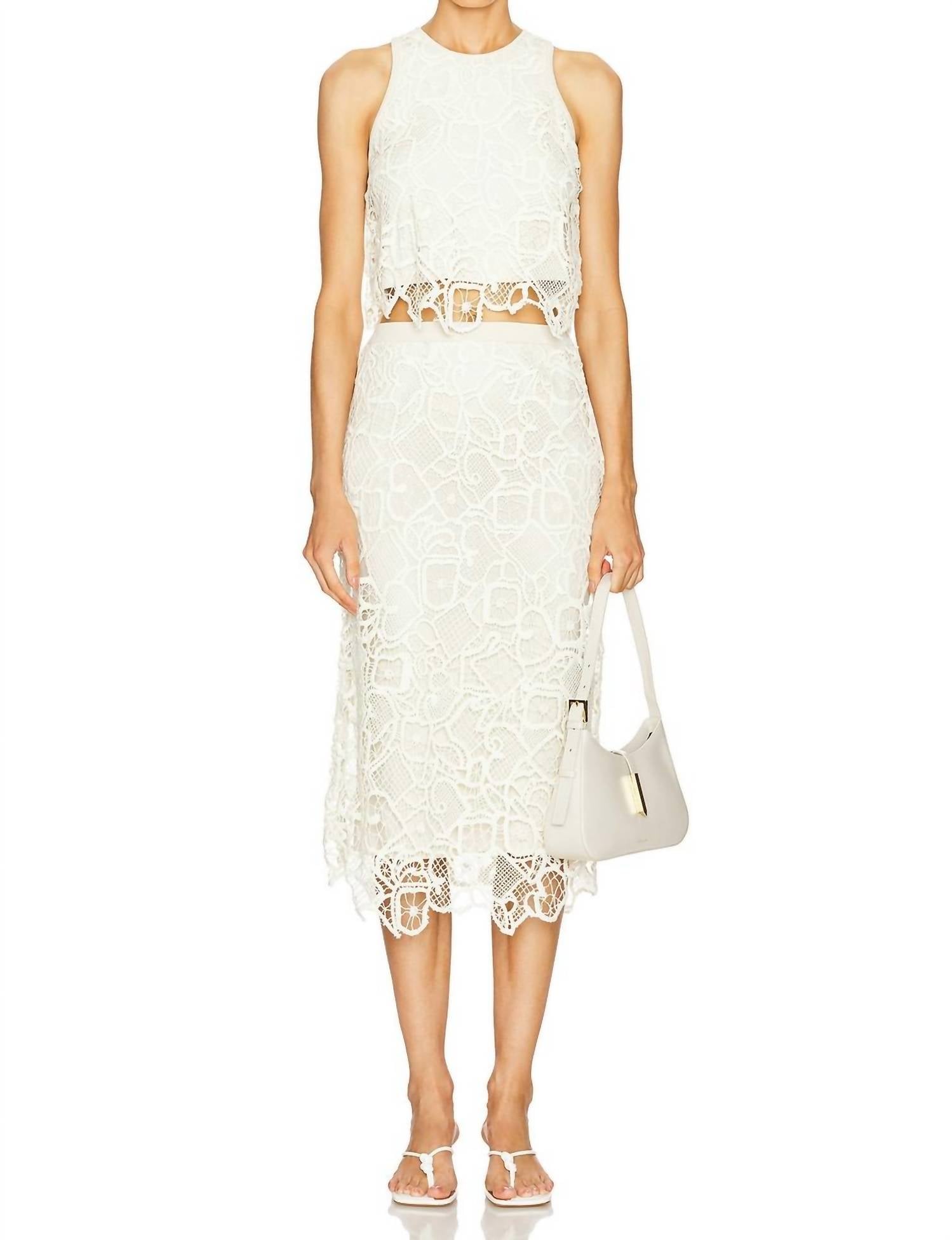 This classic tank top is perfect for layering and cute enough to wear on its own. Elevate your wardrobe with the Lena Tank Top by A.L.C., a perfect choice for holiday parties. This sleeveless design in Warm White features guipure lace fabric that embodies 90s fashion trends. Crafted with a cotton blend, it ensures both comfort and style, made in China. Closure: Back button. Care: Dry clean only.