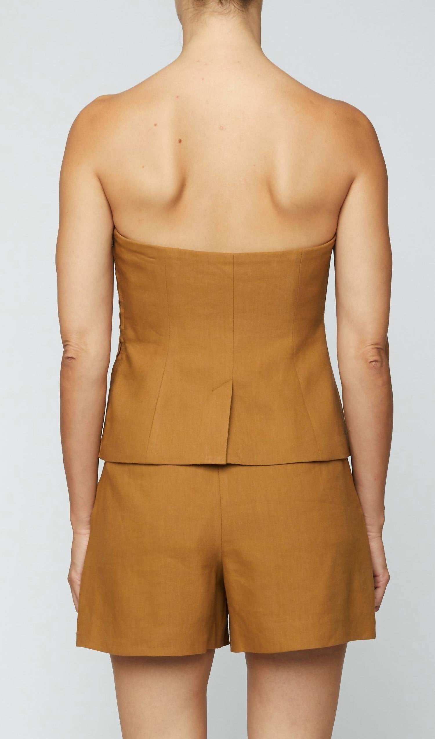 A timeless blouse that will never go out of style. The Renee Sleeveless Top by A.L.C. offers a sophisticated style in a striking copper tone, perfect for any fall occasion. This strapless off-the-shoulder blouse features a luxuriously boned bodice with nonstick silicone trim for added comfort. Crafted from a midweight linen blend, it includes a practical side zip closure and faux slip pockets. It is beautifully lined with two blends, providing both structure and flexibility, and is proudly made in Vietnam. Care: Dry clean only.