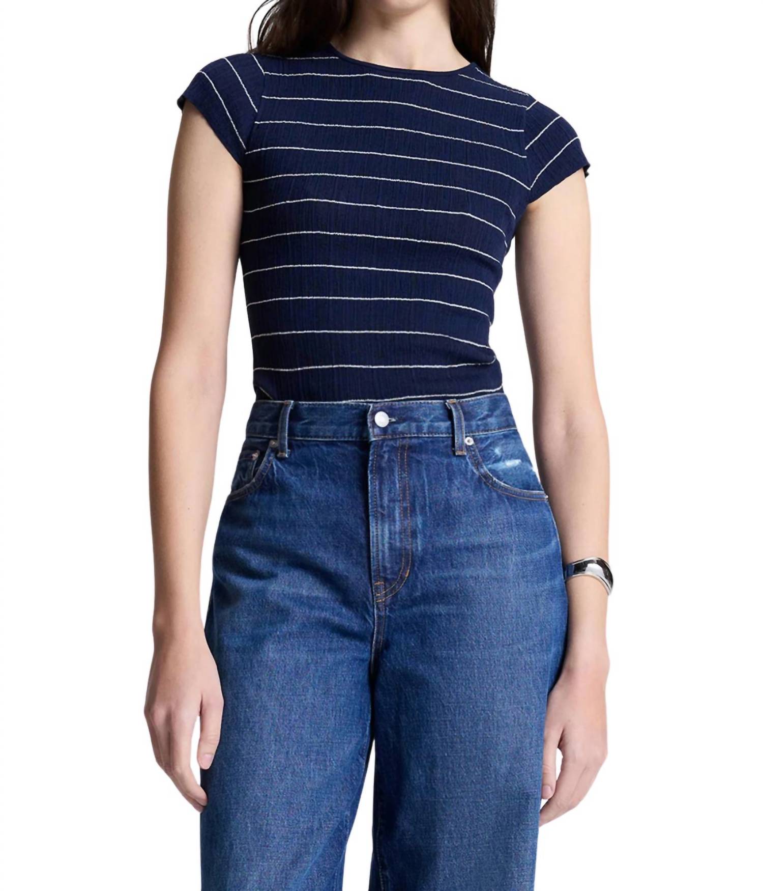 Elevate your summer wardrobe with the Sam Top by A.L.C., a chic choice for back-to-school with its classic navy and white stripes. Crafted from a 78% cotton and 22% nylon blend, this cap sleeve tee offers a modern crewneck design in a short-sleeve style. With a convenient pull-on closure, it provides ease and comfort for everyday wear. Made with care instructions stating dry clean only, this top promises to keep you stylish and comfortable all season long.