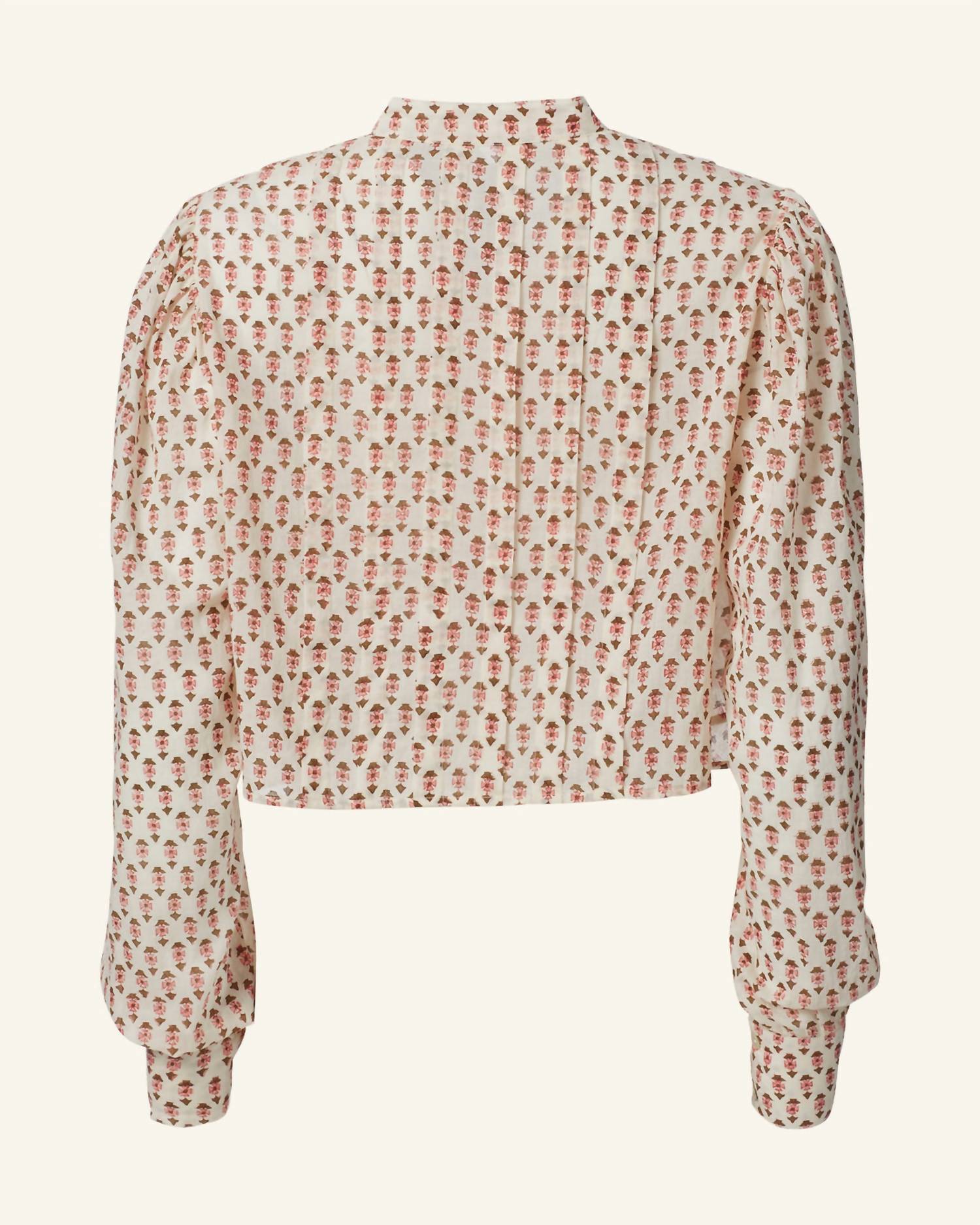A long sleeve top you can wear with denim, skirts, well... just about anything! Elevate your style with the Ryland Antique Shirt by ALIX OF BOHEMIA, a timeless piece inspired by a Victorian silhouette. This long sleeve shirt, crafted from 100% cotton voile and hand-block printed with a delicate floral motif, invites admiration with its intricate pleating details and mother-of-pearl button closure. Designed in a cropped length with exquisite craftsmanship, it serves as an elegant addition to your summer wardrobe, perfect for vacation occasions. Care: Machine wash. Model is 5'9" and is wearing a size S.