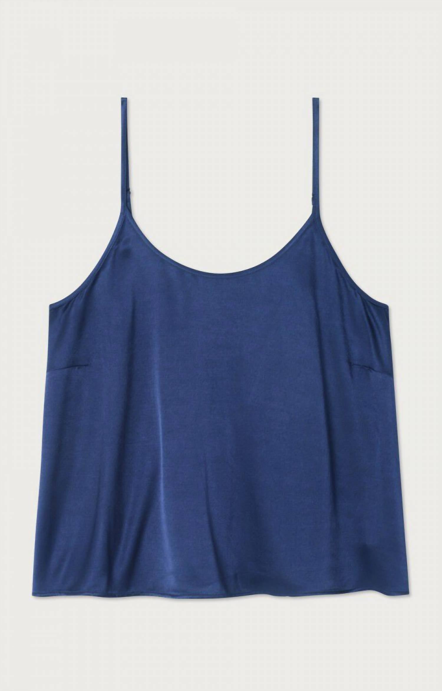 Fit, fabric and functionality. This tank top checks all the boxes. Embrace elegance with the Voogy Scoop Sleeveless Top by American Vintage, perfect for summer soirées. This minimalist piece features a scoop neckline and adjustable thin straps, offering a custom fit in solid blue. Made from 100% viscose, it promises a soft, flowing drape for a delicate silhouette. Care is simple with a pull-on closure; just hand wash and line dry to maintain its vibrant charm.