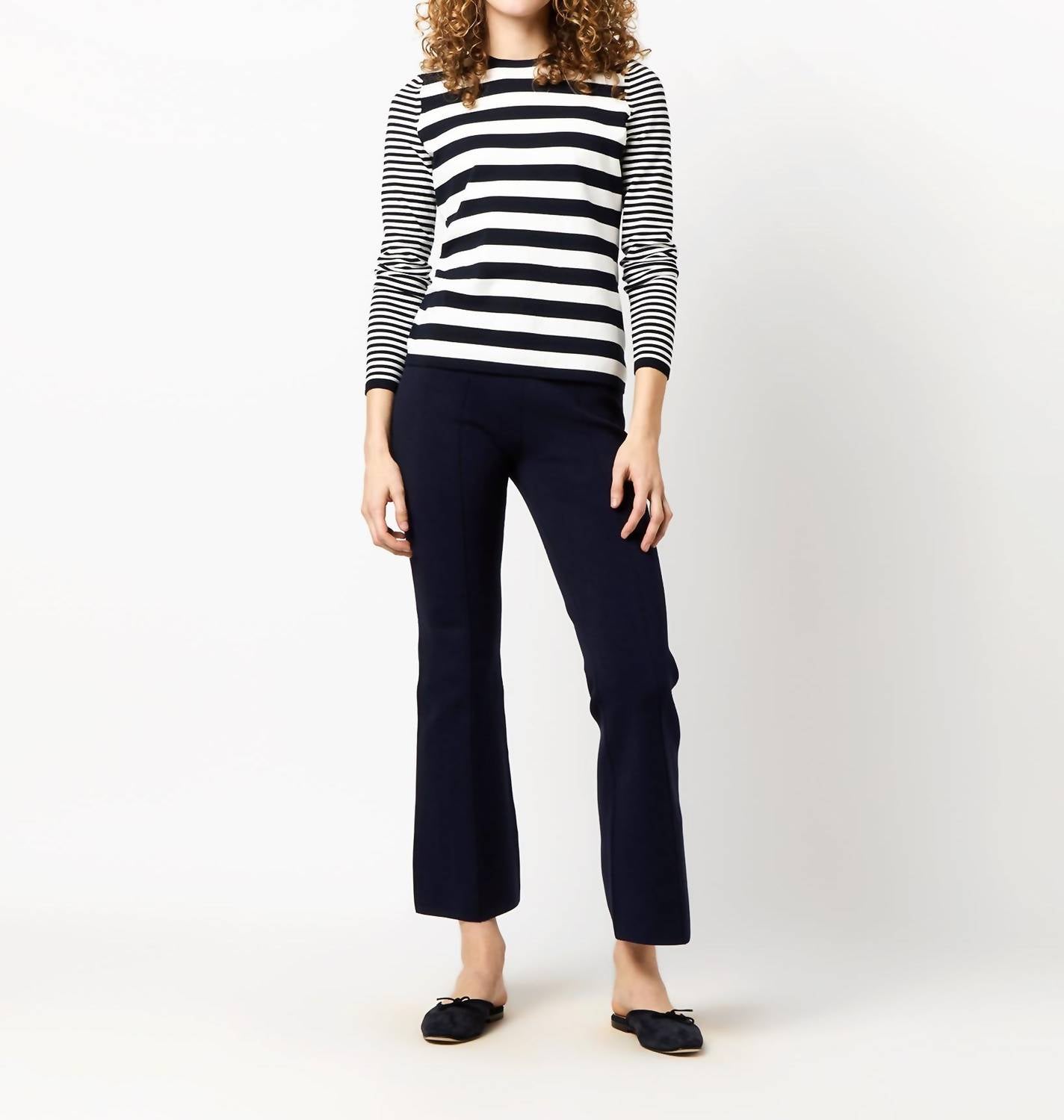 The perfect long sleeve tee that goes with just about anything. Elevate your spring layering with the Alida Crewneck Stripe Tee by Ann Mashburn, crafted in a chic ivory and navy stripe pattern. This long sleeve tee features fully fashioned, 3-ply high-twist cotton knit enhanced with elastane for a comfortably snug fit. Made in China, this sweater includes delicate ribbing at the collar, sleeves, and hem, and is designed with a crew neckline and a pull-on closure. For optimal care, hand wash cold and lay flat to dry, ensuring it maintains its pristine look throughout the season. Model is 5'10" and wears size S.