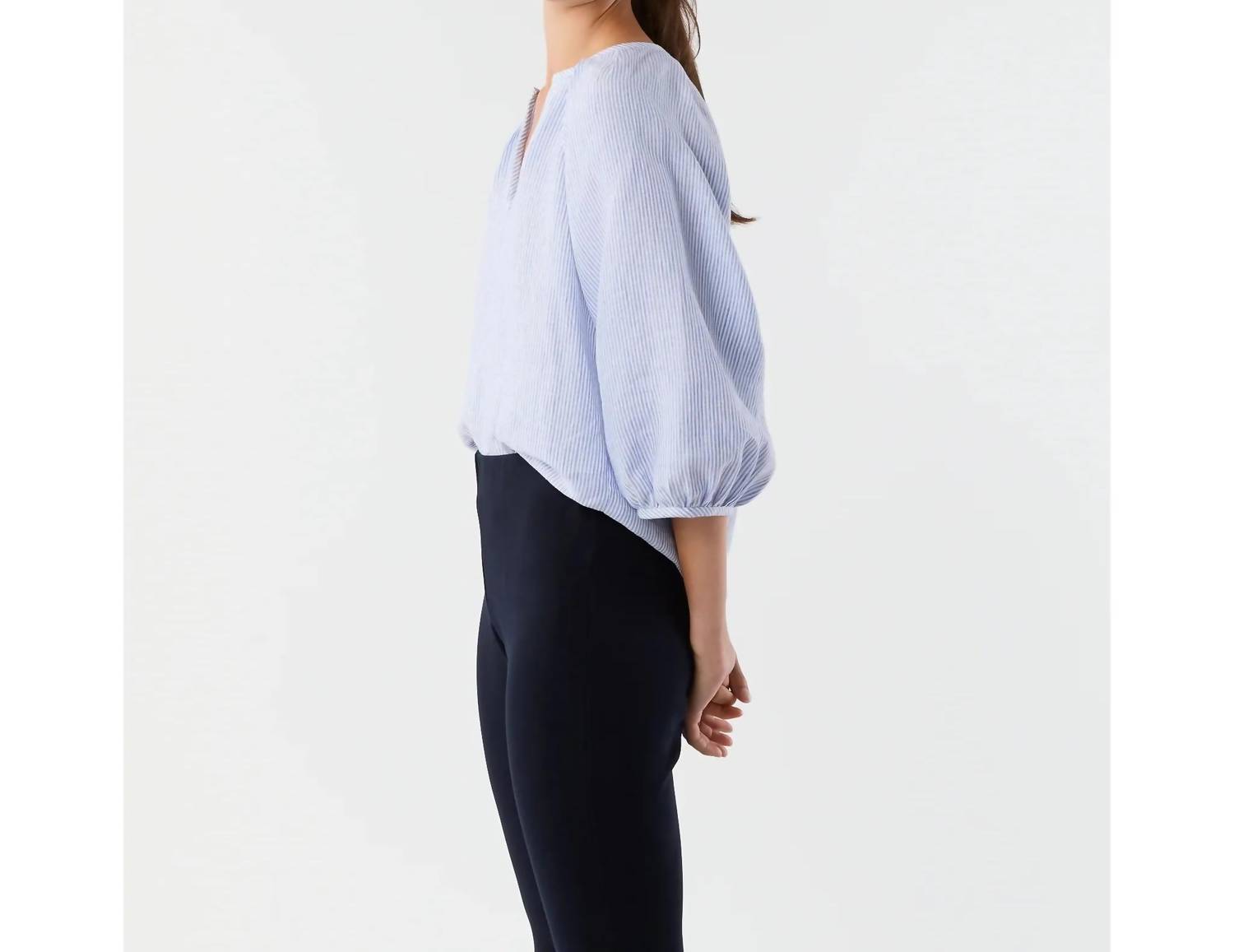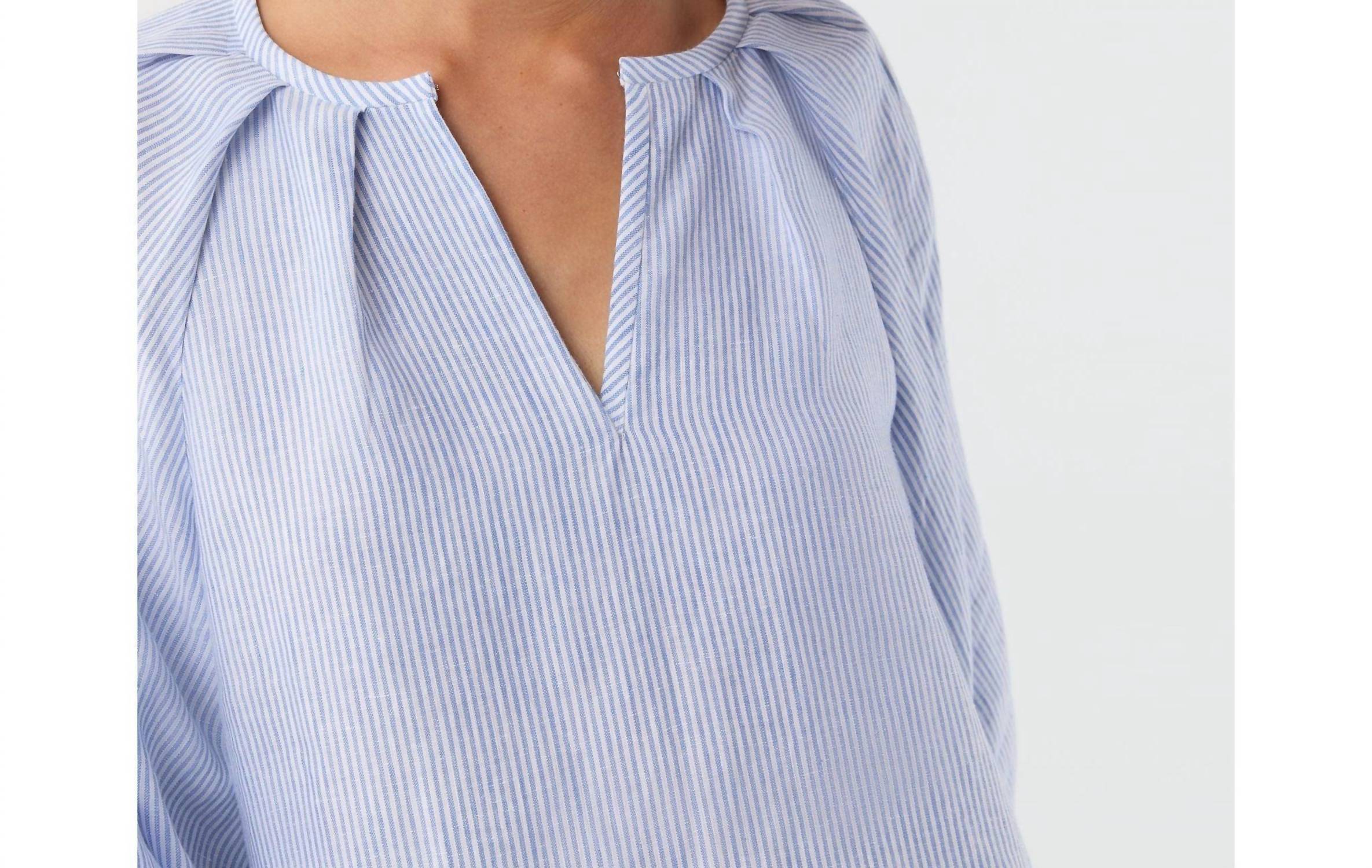 A versatile blouse that works from desk to dinner! Discover the Victoria Blouse by Ann Mashburn, a must-have for your spring and summer wardrobe in a serene sky and white small Bengal stripe. Crafted with 100% Belgian linen, this lightweight blouse features a V-neckline with pleated details and a hook-and-eye closure, complemented by three-quarter sleeves. Made in China, its airy design offers versatility, whether tucked in or worn out. Care is a breeze with machine wash medium, tumble dry low, and the option for dry cleaning, avoiding bleach to maintain its delicate charm.