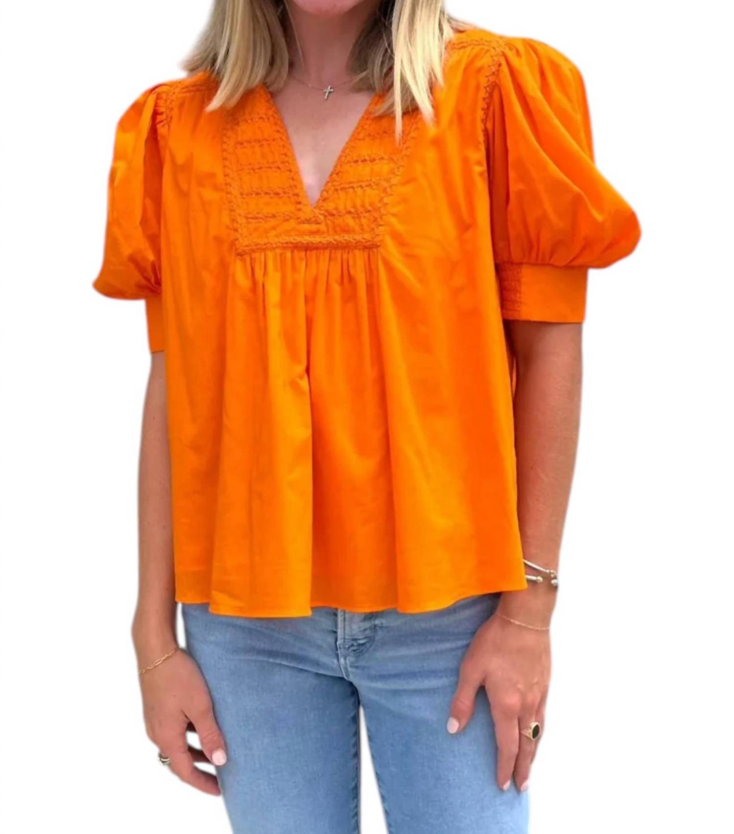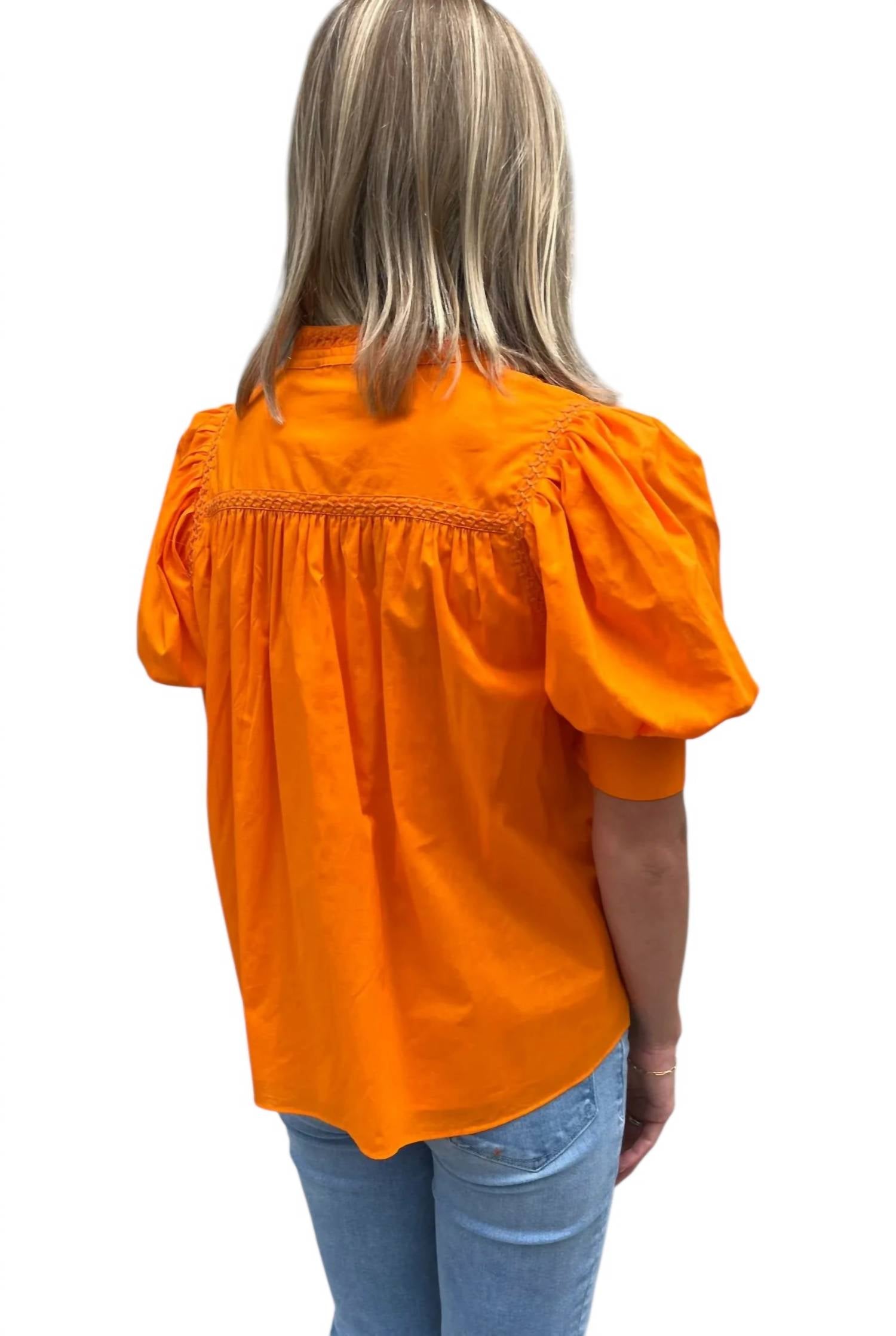 A timeless blouse that will never go out of style. Crafted in a stunning Exuberance hue. Short-sleeve blouse boasts puff sleeves with a cuffed finish, complemented by intricate embroidered details and a chic V-neckline. Designed as a pull-on style. Perfect travel companion for showcasing your University of Tennessee spirit or indulging in 90s fashion trends. Hand wash to maintain the garment's quality.