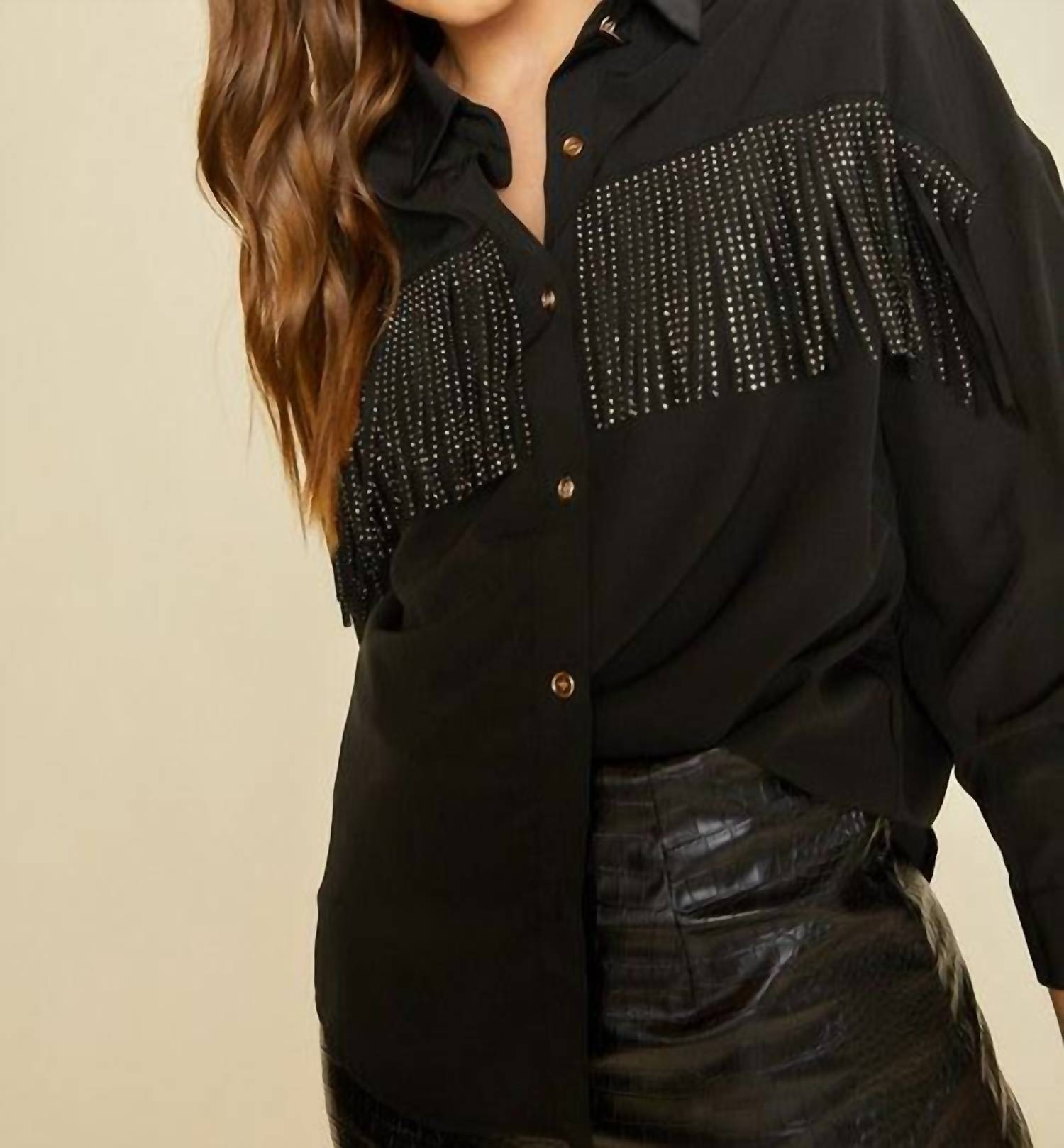 Pair this with your favorite jeans and slides for your next girls night out. Elevate your wardrobe with the AnnieWear Rhinestone Fringe Blouse, a standout piece in sophisticated black perfect for any occasion. This long sleeve blouse boasts a silky polyester finish and a striking rhinestone fringe detail. The button-down closure complements its drop shoulder design, ensuring a timeless yet chic look. Care for this elegant garment by hand washing and laying flat to dry.
