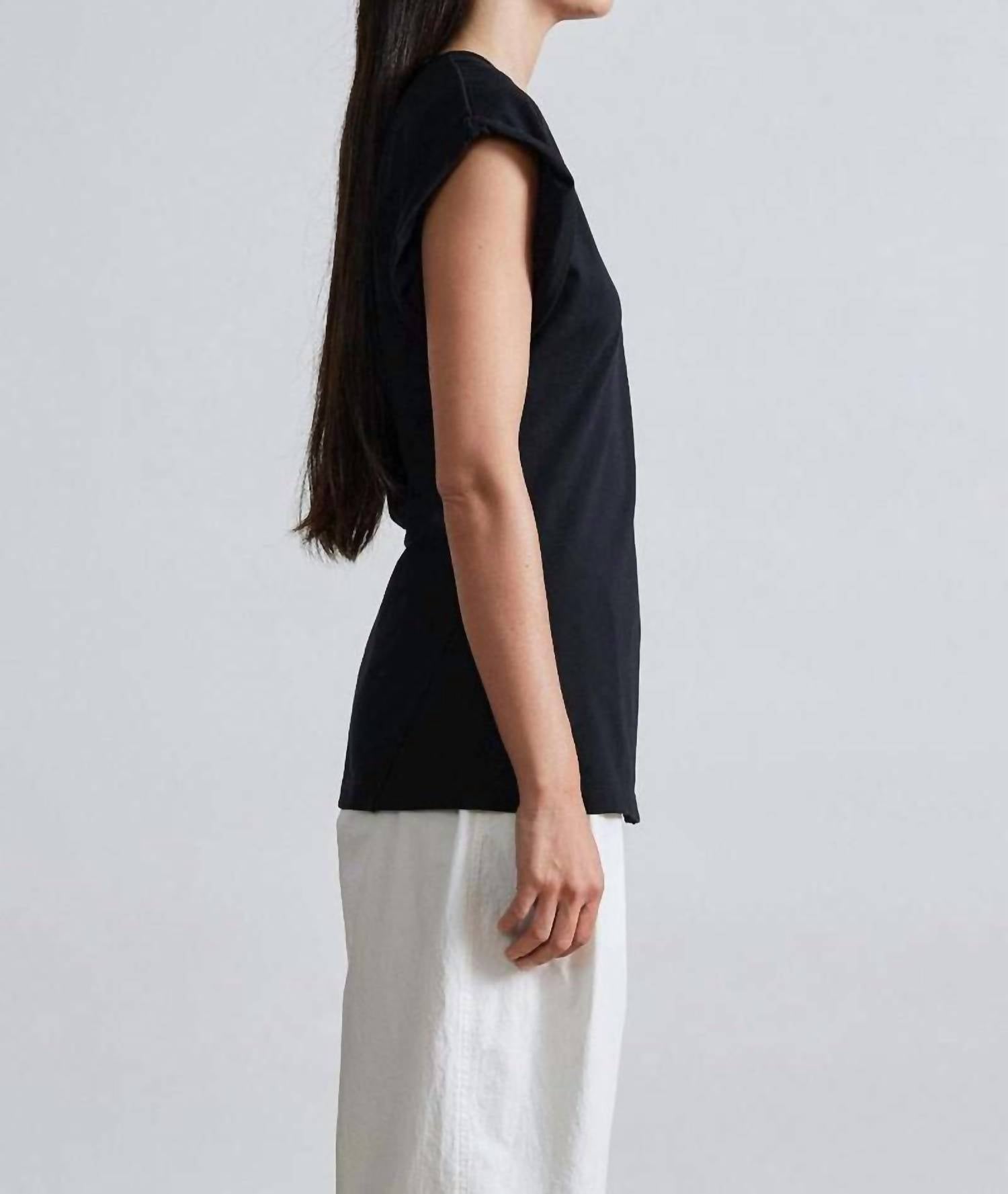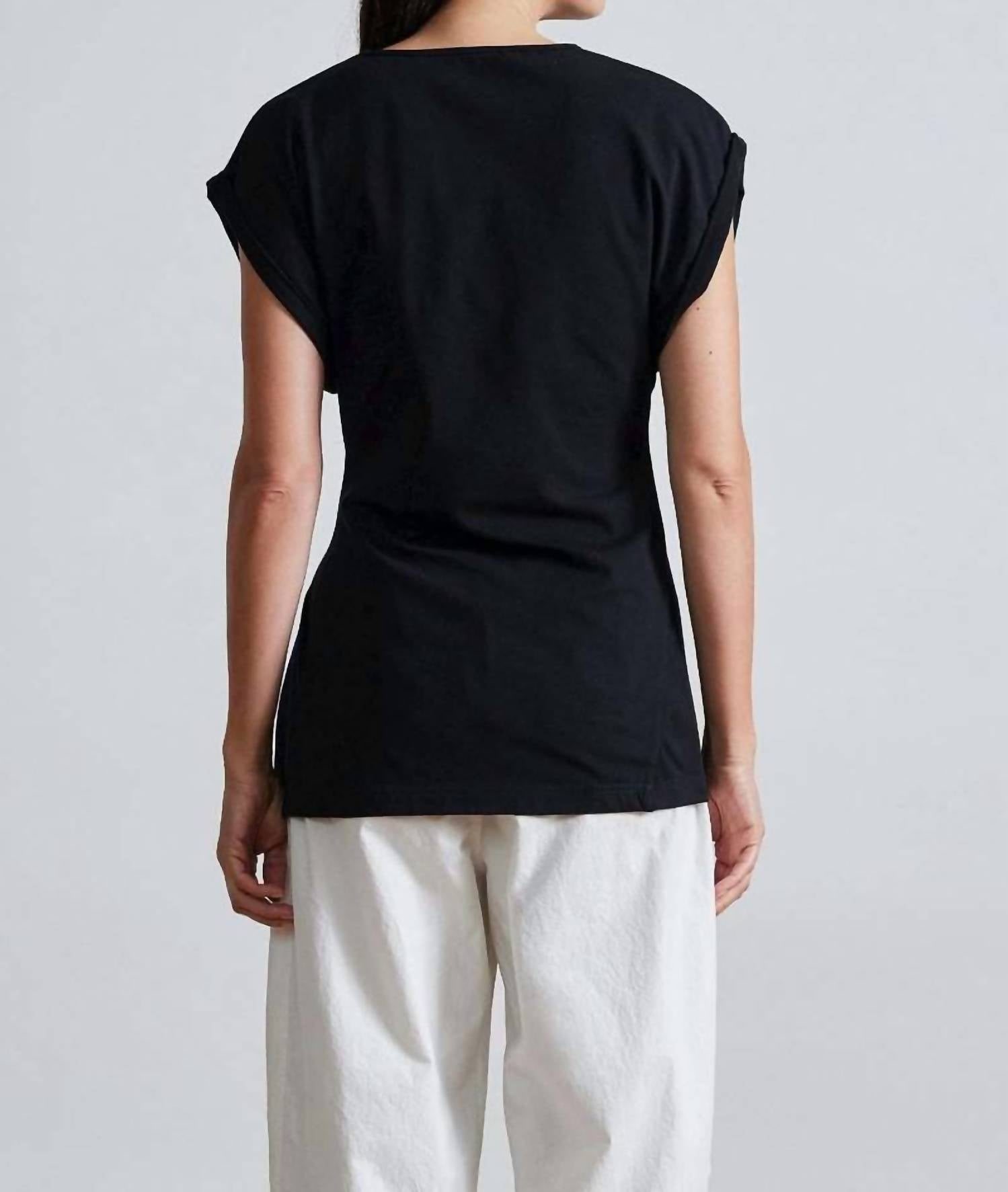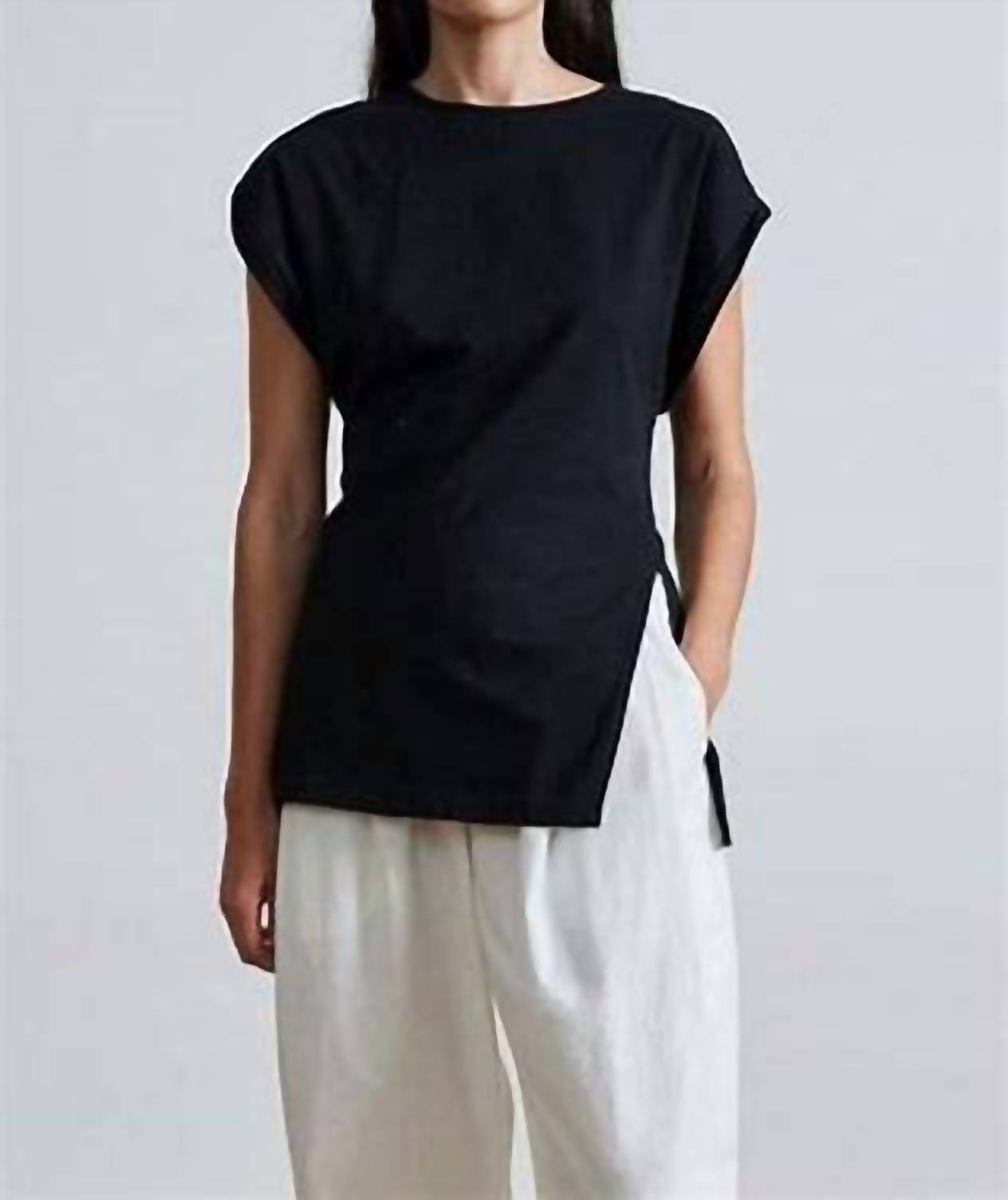 Introducing the Apiece Apart Asymmetric Crew Neck Tunic Top, a chic addition to your summer workwear wardrobe in classic black. This tunic features short, wide dolman sleeves and a stylish asymmetrical slit at the hem, providing a modern silhouette. Crafted from a cotton blend of 92.2% Cotton and 7.8% Elastane, this piece delivers both structure and stretch. Closure is effortlessly achieved with a pull-on design, and for care, machine wash cold and tumble dry are recommended.