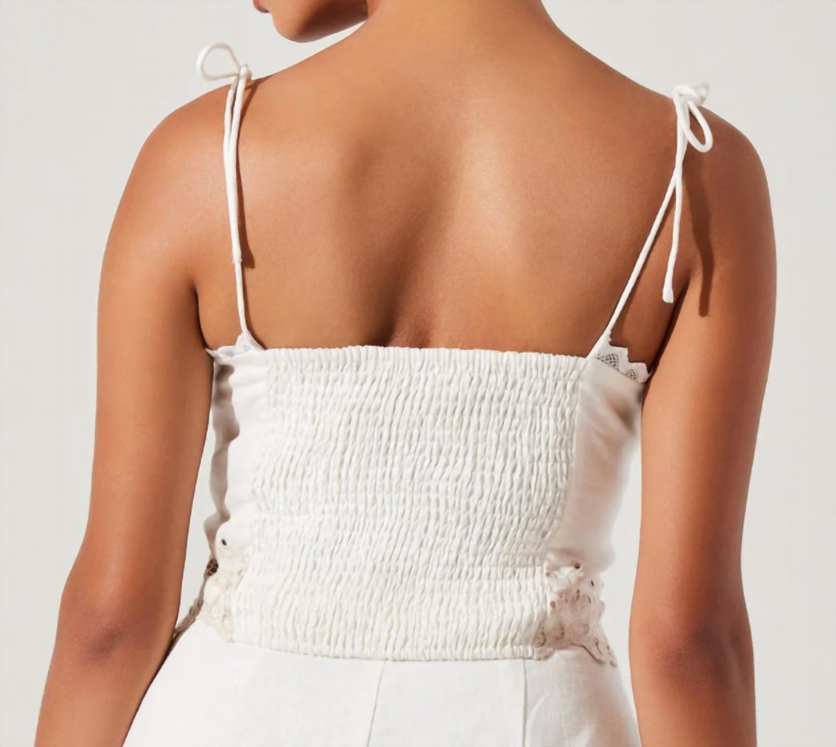 Pair this crop top with your favorite high-waisted jeans or maxi skirt. Introducing the Kiya Linen Embroidered Top by ASTR, a chic addition to your summer wardrobe. This sleeveless top showcases a textured linen fabric in a fresh white hue, accented with scallop trims. Made in China, it features a smocked back and a flattering button front closure. Composition: 100% Linen, with a lining of 100% Rayon. Care: Dry clean only. Ideal for vacations, this top offers a slightly cropped fit with adjustable self-tie straps, floral embroidery, and a sweetheart neckline.