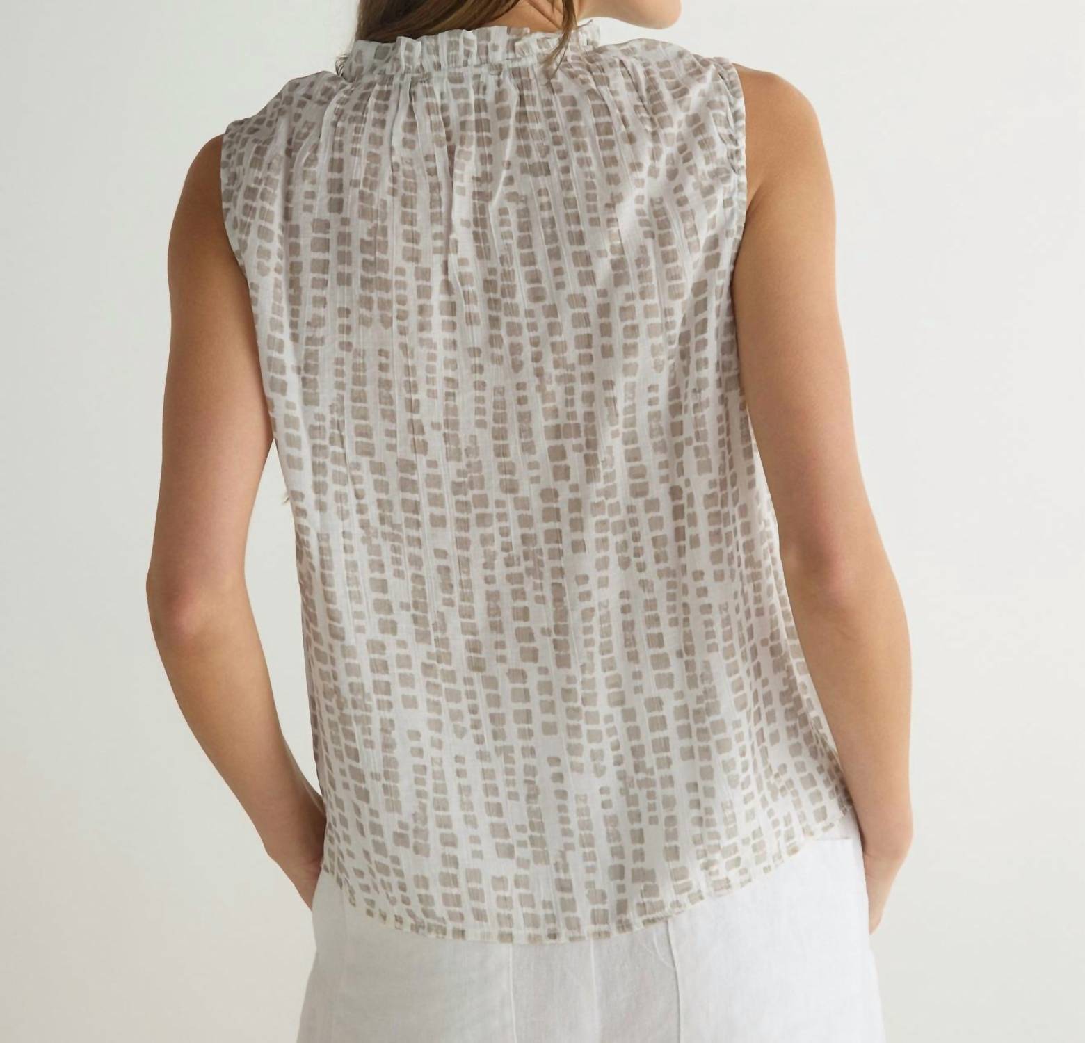Discover the Bella Dahl Ruffle Neck Tank, perfect for sunlit adventures and warm evenings. This sleeveless tank, made in the USA, is crafted from a soft, semi-sheer abstract blocks patterned fabric that features a tonal geometric print. Composed of 80% Rayon and 20% Nylon, it boasts a relaxed silhouette with subtle neckline gathering. Designed with machine wash care, it measures 22 inches in size S.