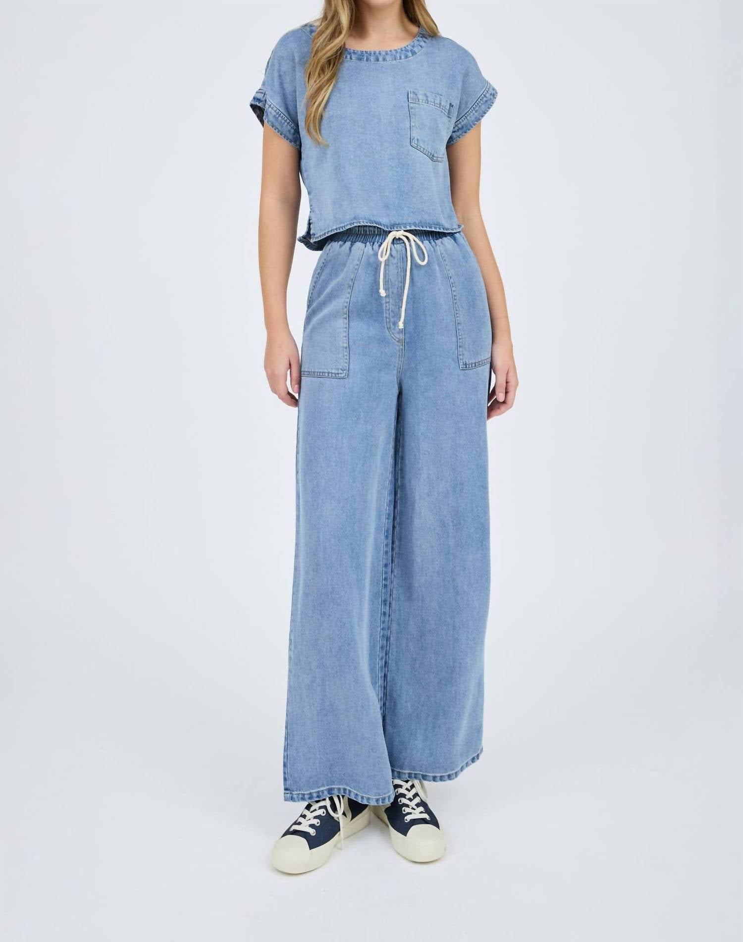 Pair this crop top with your favorite high-waisted jeans or maxi skirt. Elevate your style with the Washed Chambray Boat Neck Short Sleeve Crop Top by Blu Pepper, a perfect choice for a minimalist summer look. This solid denim top features a flattering boat neckline and is crafted from 100% Lyocell for a lightweight feel. With its cropped design and convenient pocket detail, this top aligns with contemporary trends. Closure: Pull on.