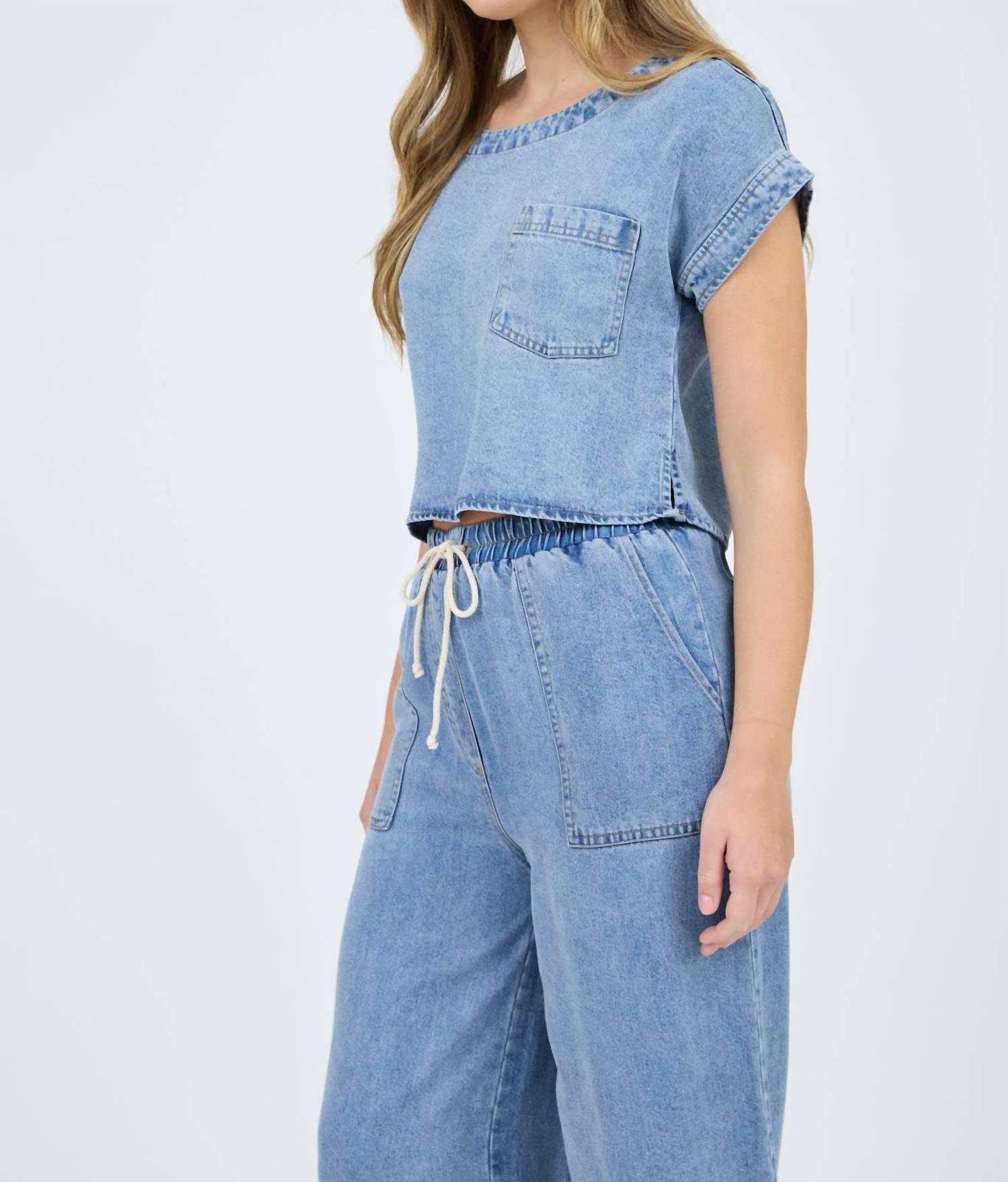 Blu Pepper - Washed Chambray Boat Neck Short Sleeve Crop Top