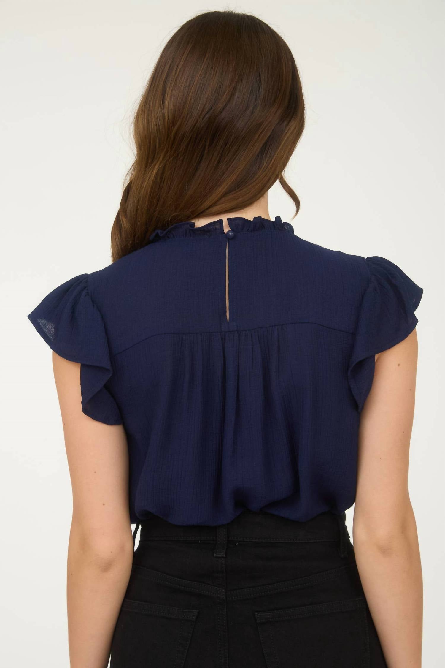 A timeless blouse that will never go out of style. Elevate your summer wardrobe with the Blu Pepper Women's Line Lace Trim Ruffle Detail Blouse in a solid navy hue. This stylish top features short sleeves with charming ruffle details and a back eye button closure for a relaxed fit. Crafted from 86% rayon and 14% nylon, with a contrast of 100% polyester, this lightweight blouse offers a breathable feel. Care instructions include machine wash and tumble dry for easy maintenance, making it perfect for vacation attire.