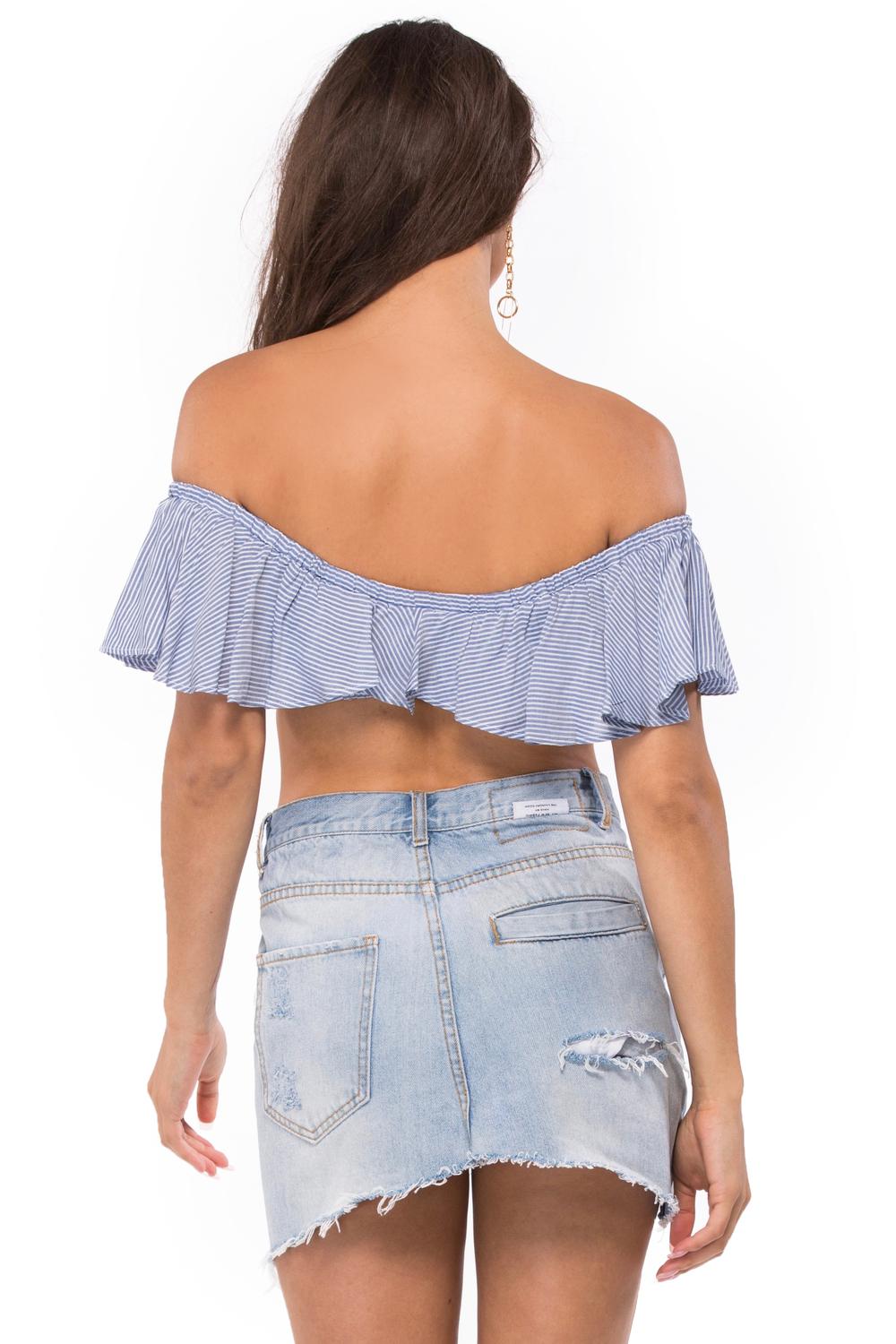 Show a little skin in this cute and casual crop top. Introducing the Melanie Off The Shoulder Lace Top by Blue Life, a stylish choice for evening events in a striking Denim Stripe Blue. This women’s crop top combines short sleeves with a chic off-the-shoulder neckline and features a lace-up front for a flirty touch. Crafted from 100% Rayon, it offers a luxurious drape and feel. Closure: Tie closure. Perfectly embodying summer vibes, it's a must-have piece for your wardrobe.