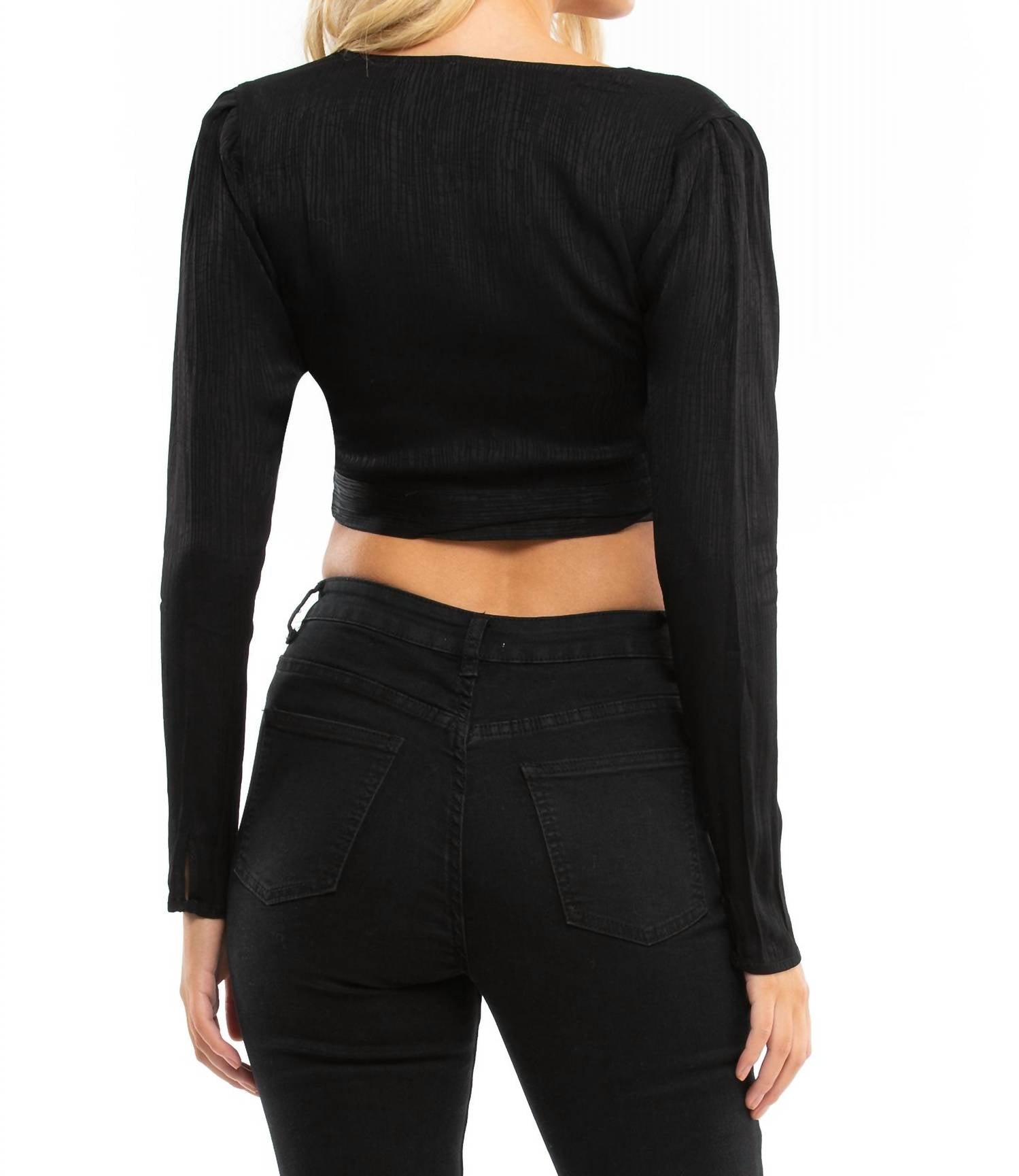 Pair this with your favorite jeans and slides for your next girls night out. Introducing the Roma V-neck Long Sleeve Top by Blue Life, a sophisticated choice for evening events in a midnight hue. Crafted from 100% Rayon, this solid, cropped blouse features long sleeves, buttons down the front, and a chic bow tie waist for a flattering silhouette. Closure: Tie closure. Ideal for showcasing quiet luxury in your spring wardrobe. Model wears size S.