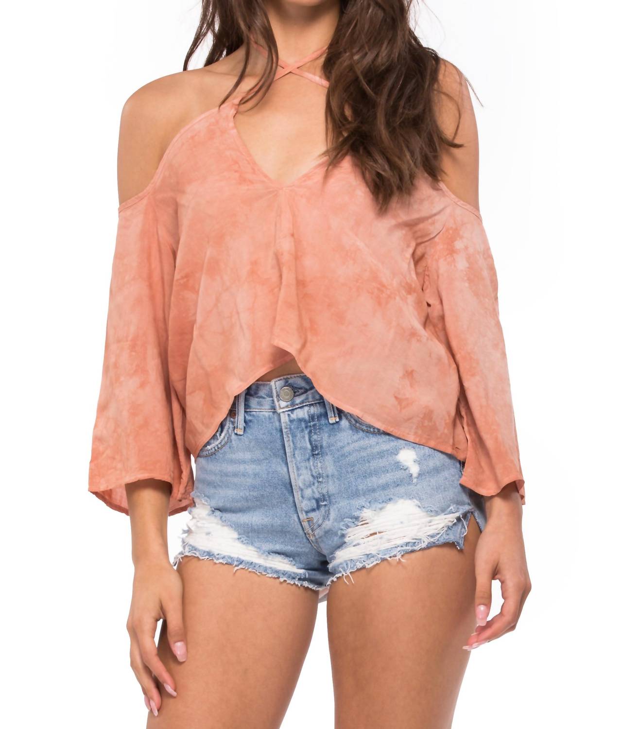 A timeless blouse that will never go out of style. Introducing the Blue Life Sophia Halter Top, an exquisite piece in Monaco Sunset perfect for evening events. This fine women's blouse features a three-quarter sleeve length with a chic halter neck tie closure and off-the-shoulder detail, encapsulating the quiet luxury trend. It is made entirely of rayon, delivering a lightweight and fluid fit. Model wears size XS, highlighting the top's elegant tie-dye pattern, perfect for the spring season.