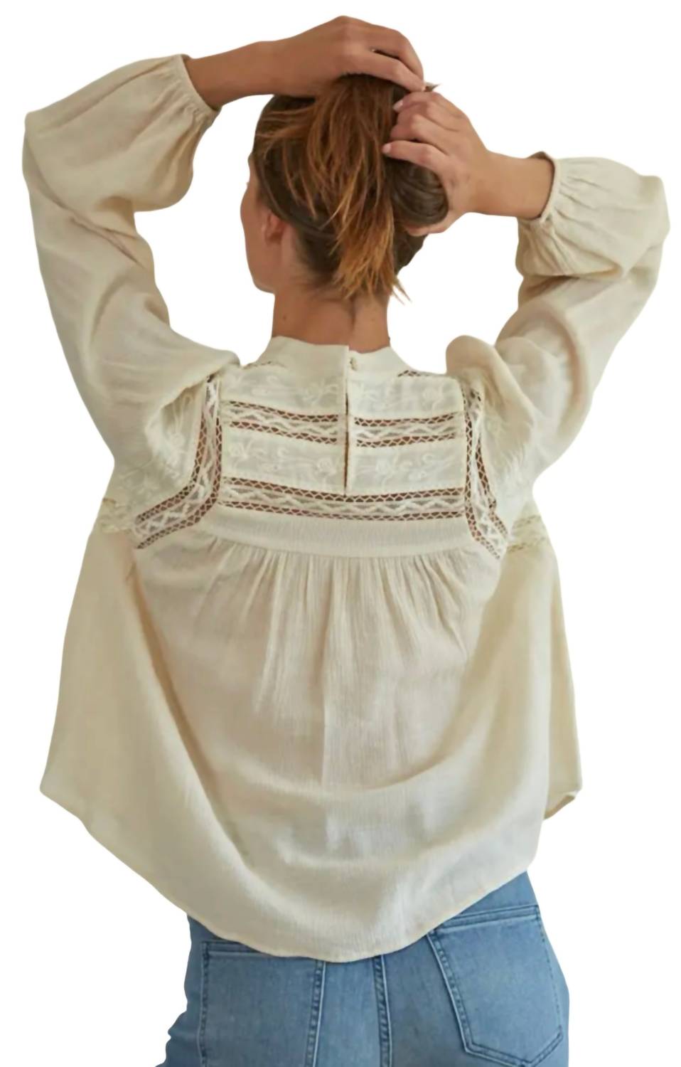 Introducing the Woven Long Sleeve Mock Neck Top by By Together, perfect for adding a boho chic touch to your spring wardrobe. Crafted from rayon, this women's blouse features a mock neck and intricate lace details, enhancing its textured pattern in a natural hue. With a sophisticated back keyhole, it offers a casual yet elegant style. Enjoy the convenience of a button closure and keep it looking fresh with machine wash and lay flat to dry care instructions.