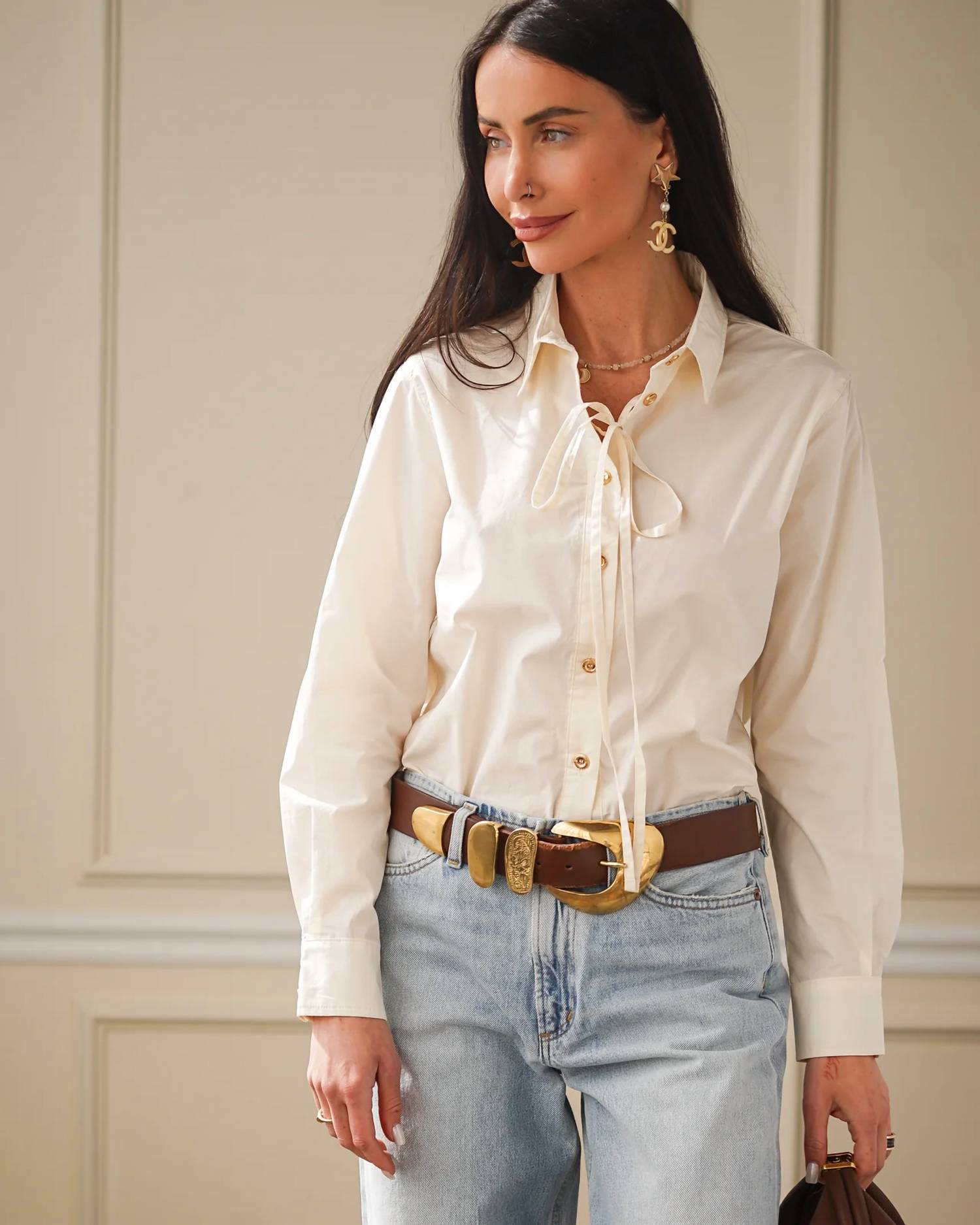 A long sleeve top you can wear with denim, skirts, well... just about anything! Experience the sophistication of the Secretariat Poplin Shirt by Care Tucker, a chic addition to any wardrobe. Crafted from organic cotton, this long sleeve shirt offers a luxurious feel in a timeless ivory hue. The elegant collared design is coupled with a practical button closure for added style and convenience. To maintain its pristine condition, lay flat to dry after washing.