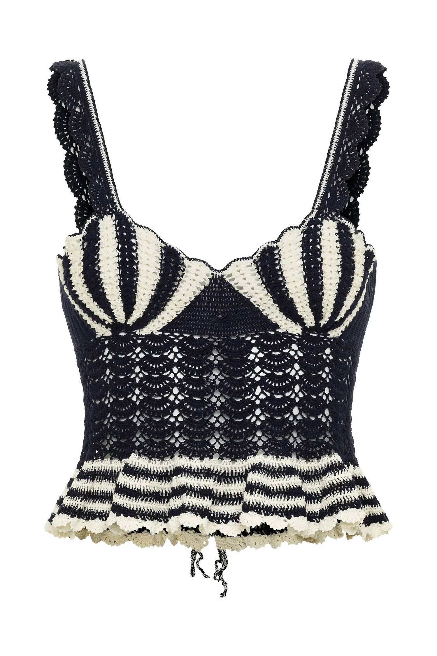 Presenting the Shell Crochet Top by CAROLINA K, a sleeveless tank in a chic navy hue perfect for adding texture to your wardrobe. With a seashell-inspired bust, bustier style, and charming sweetheart neckline, this cropped top stands at a length of 19.75 inches. Made from 100% cotton, it features a lace-up back for a custom fit. Care: Wash cold. Imported.