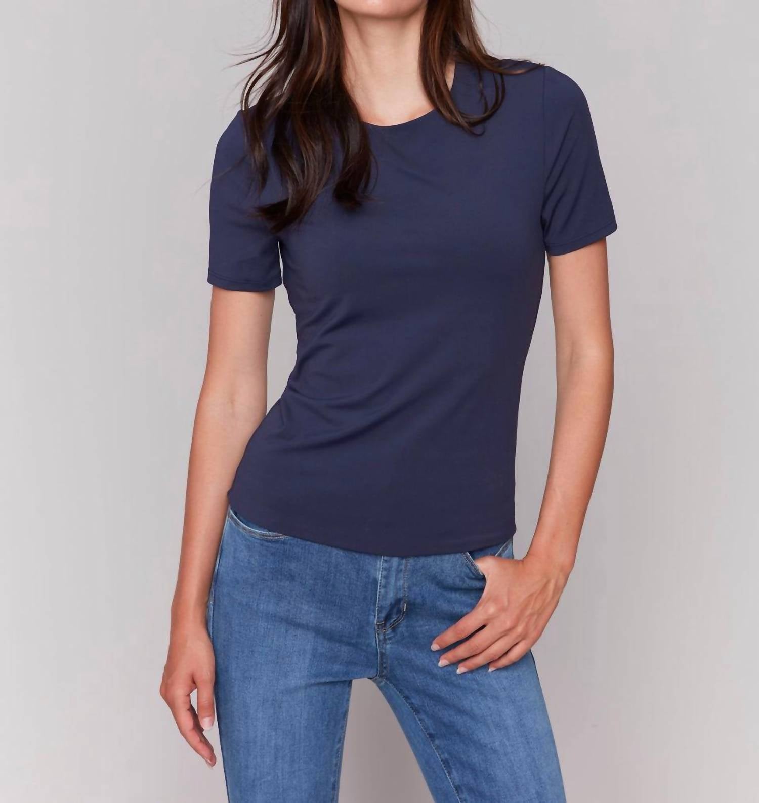 This classic, short sleeve tee will be your go-to staple this season and beyond. Discover the CHARLIE B Double Cloth Short Sleeve Tee, an essential piece in your wardrobe that combines comfort and style. Crafted from a double layer of super stretch fabric, this navy blue tee is made of 90% Nylon and 10% Spandex for a slim fit and effortless movement. Its minimalist design features a crew neckline and short sleeves, perfect for layering or wearing on its own. With pull-on closure and simple care instructions of hand wash and lay flat to dry.