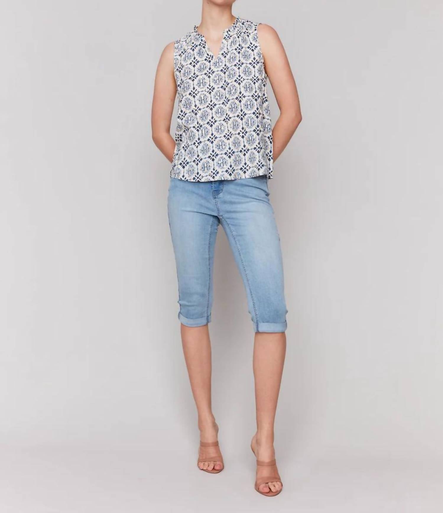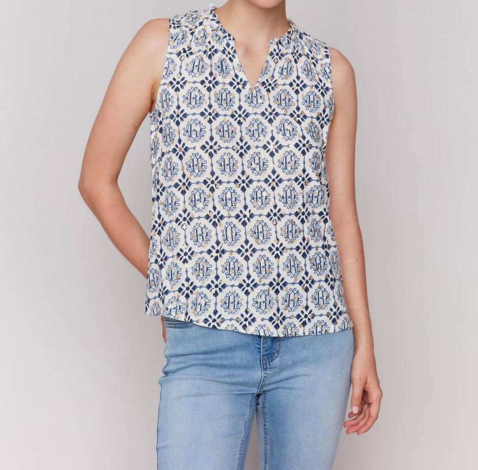 A versatile blouse that works from desk to dinner! Elevate your wardrobe with the Ruffle Collar Geometric Pattern Blouse by CHARLIE B, featuring a striking blue geometric pattern perfect for both work and play. This sleeveless blouse boasts a delicate ruffle collar and a V-neck, adding a chic flair to any outfit. Designed with a pull-on closure for ease, it encapsulates the Boho Chic trend, making it an ideal choice for a stylish spring. Care: Hand wash and lay flat to dry.