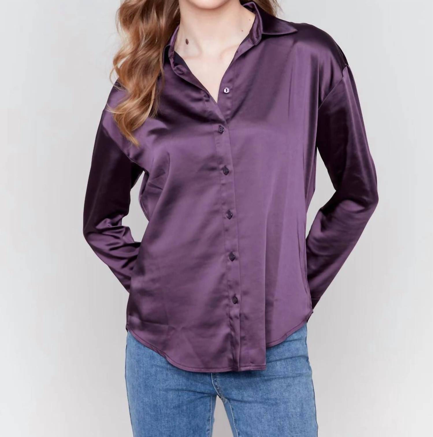 The perfect long sleeve tee that goes with just about anything. Elevate your workwear wardrobe with the Solid Button-down Shirt by CHARLIE B, proudly crafted for women with an eye for style. This chic plum-colored shirt showcases long sleeves and a classic collar made of satin, perfect for evening events or a Valentine's Day celebration. Featuring a button closure, this solid-patterned shirt is both sophisticated and versatile. For best care, hand wash and lay flat to dry.