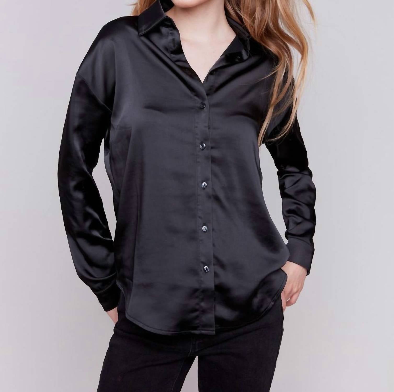 A timeless blouse that will never go out of style. Introducing the Solid Satin Button-down Shirt by CHARLIE B, a sophisticated addition to your wardrobe. This long sleeve blouse in a rich black hue offers a minimalist design perfect for evening events and workwear alike. Crafted from satin for a luxurious feel, it features a classic collar and convenient button closure. Care: Hand wash and lay flat to dry.