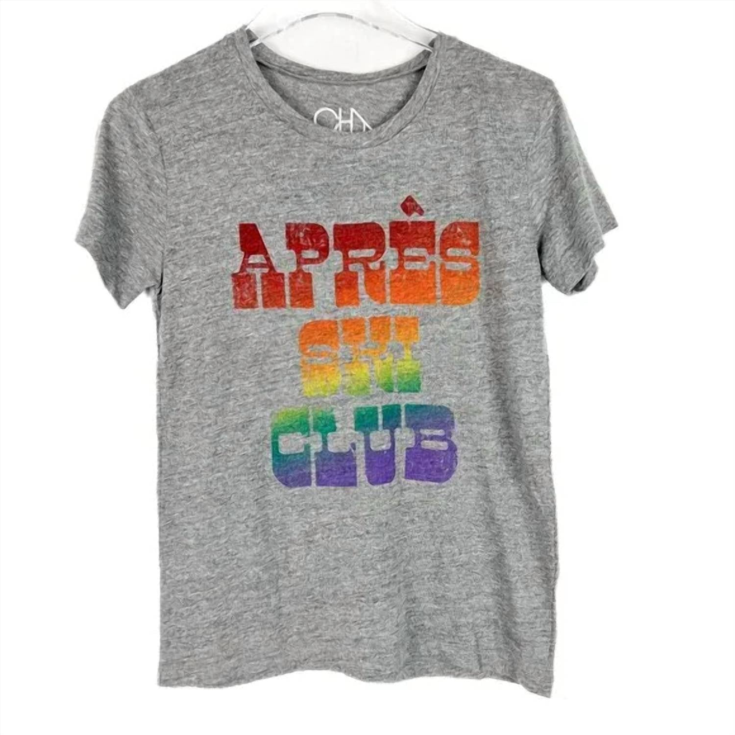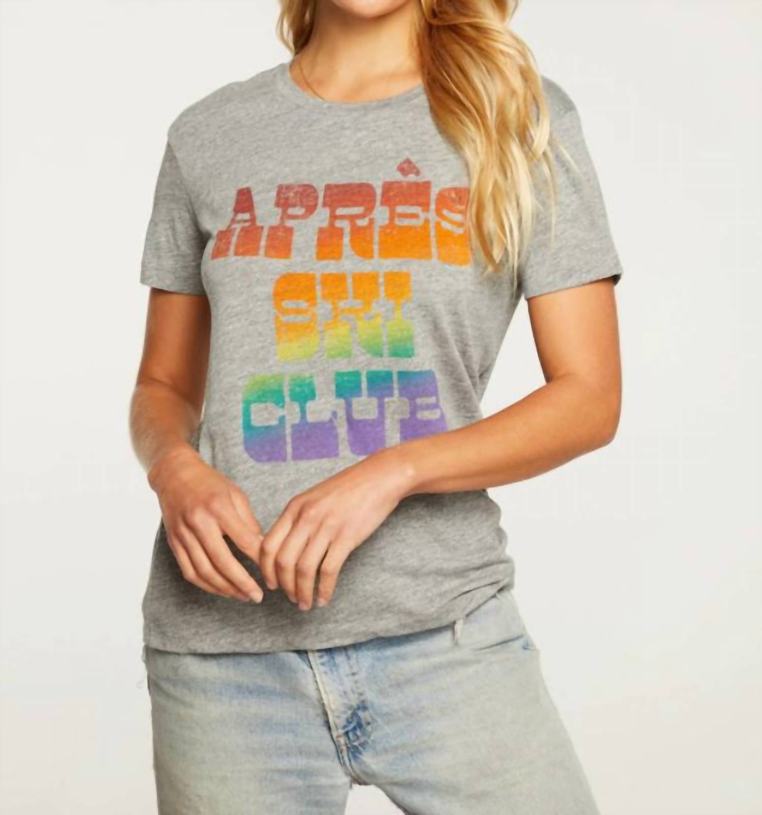 The short sleeve tee you'll want in every color. Elevate your summer wardrobe with the Apres Ski Tee by Chaser, designed for women who love streetwear. This grey graphic short sleeve tee is crafted from a soft triblend jersey composed of 50% Polyester, 38% Cotton, and 12% Rayon. Featuring a classic crewneck and an easy pull-on closure, it's perfect for music festivals and casual gatherings. Care is effortless with machine wash and tumble dry instructions.