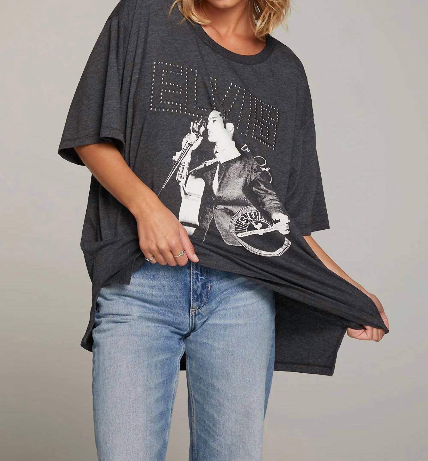 Celebrate the legendary King of Rock & Roll with the Chaser Sun Records Elvis Tee, a tribute in sleek black. Featuring short sleeves crafted from a soft cotton-polyester blend, this oversized crewneck tee offers a relaxed fit for a flattering silhouette. Closure: Pull on. Care: Machine wash cold, delicate. Perfect for music festivals or channeling vintage vibes, this graphic tee is a must-have for every Elvis fan.