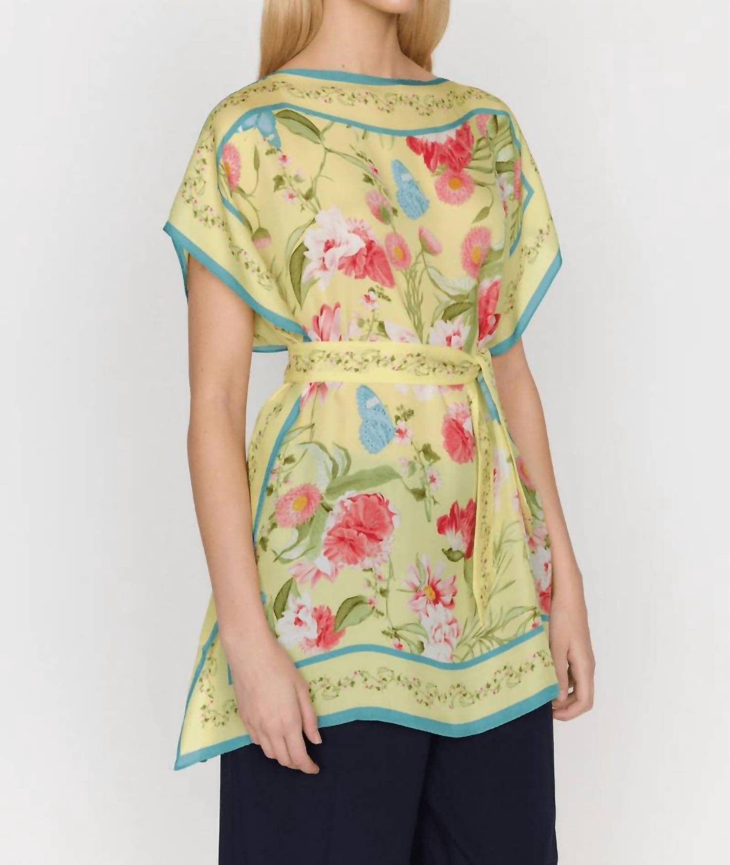 Embrace the versatility of this tunic-style blouse, expertly crafted for seamless layering or perfect to wear on its own. Its detailed design and comfortable fit make it a perfect addition to any closet. Meet the Pamela Tunic Top by CHRISTY LYNN, a luxurious addition to your wardrobe featuring a signature floral scarf print. Crafted from a silk viscose blend, this short sleeve piece offers a flowing silhouette for ease and comfort while maintaining a polished look. Closure: Pull on. Care: Machine wash cold. 53% Silk, 47% Viscose. Imported. Perfect for a spring dinner party or any St. Patrick's Day celebration.