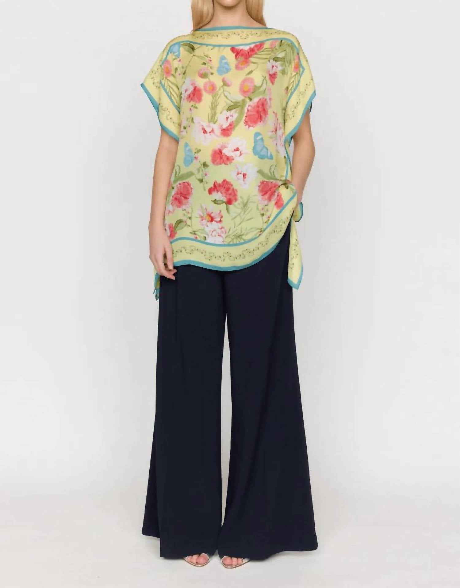 Meet the Pamela Tunic Top by CHRISTY LYNN, a luxurious addition to your wardrobe featuring a signature floral scarf print. Crafted from a silk viscose blend, this short sleeve piece offers a flowing silhouette for ease and comfort while maintaining a polished look. Closure: Pull on. Care: Machine wash cold. 53% Silk, 47% Viscose. Imported. Perfect for a spring dinner party or any St. Patrick's Day celebration.