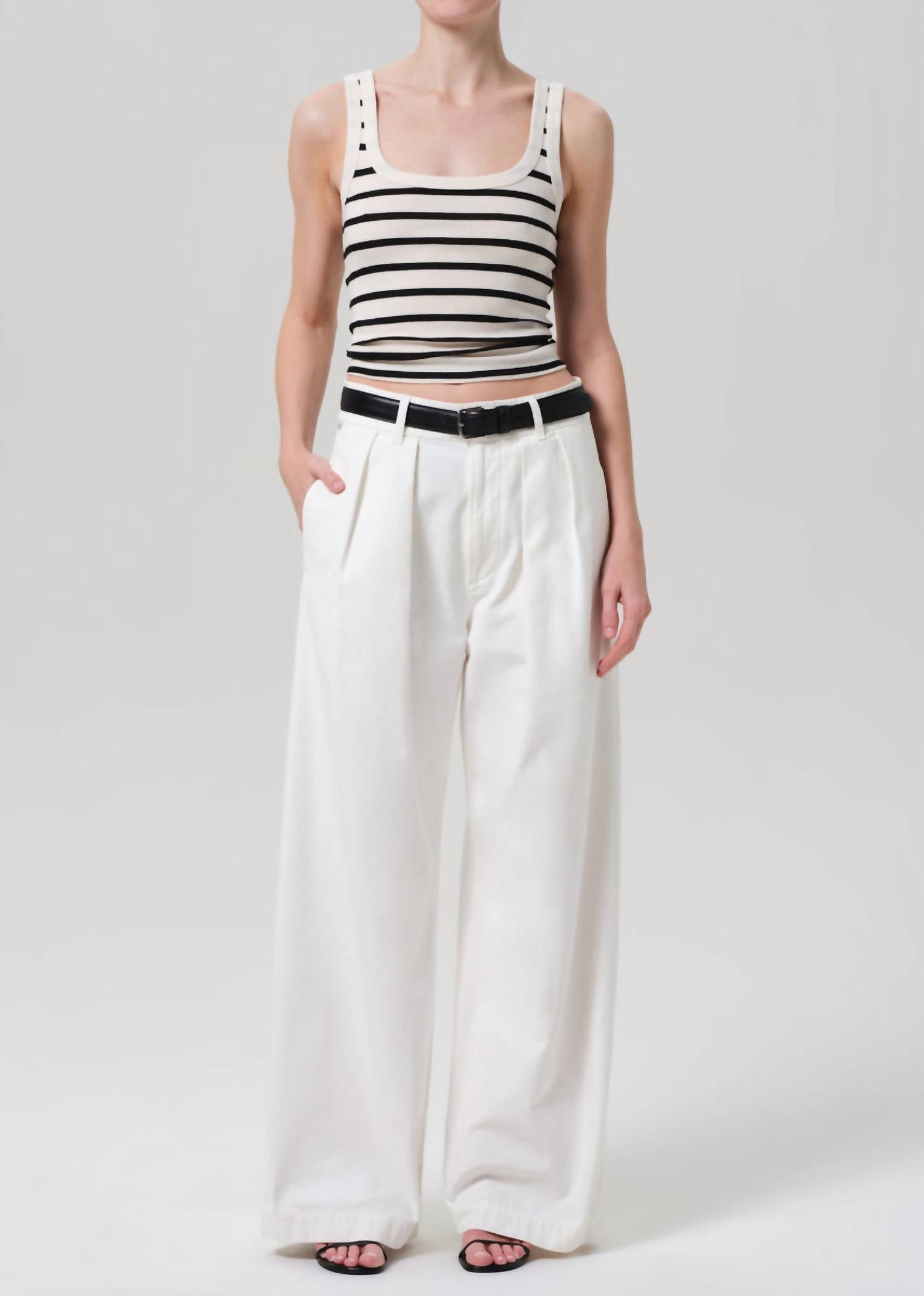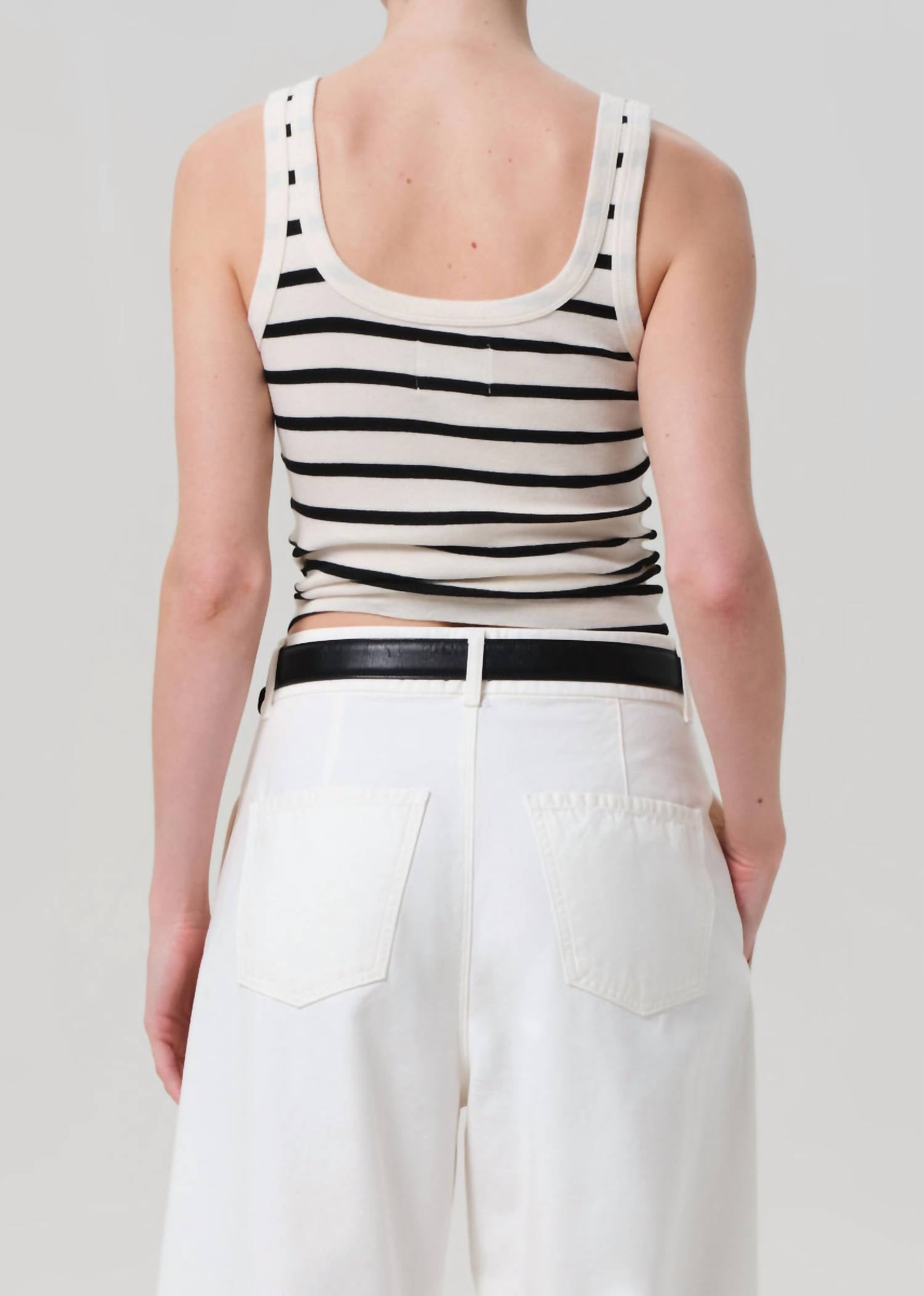 The Faye Tank by Citizens of Humanity is a staple for any wardrobe, crafted for effortless style with its sleeveless design and made from an ultra-lightweight cotton blend. This tank features a flattering scoop neck and a slightly cropped fit at 19.5 inches, making it versatile for high-rise jeans or skirts. 80% Cotton, 20% Polyester. Made in the USA from imported materials. Machine wash cold. Pull on. Model is 5'10" and wears a size small.