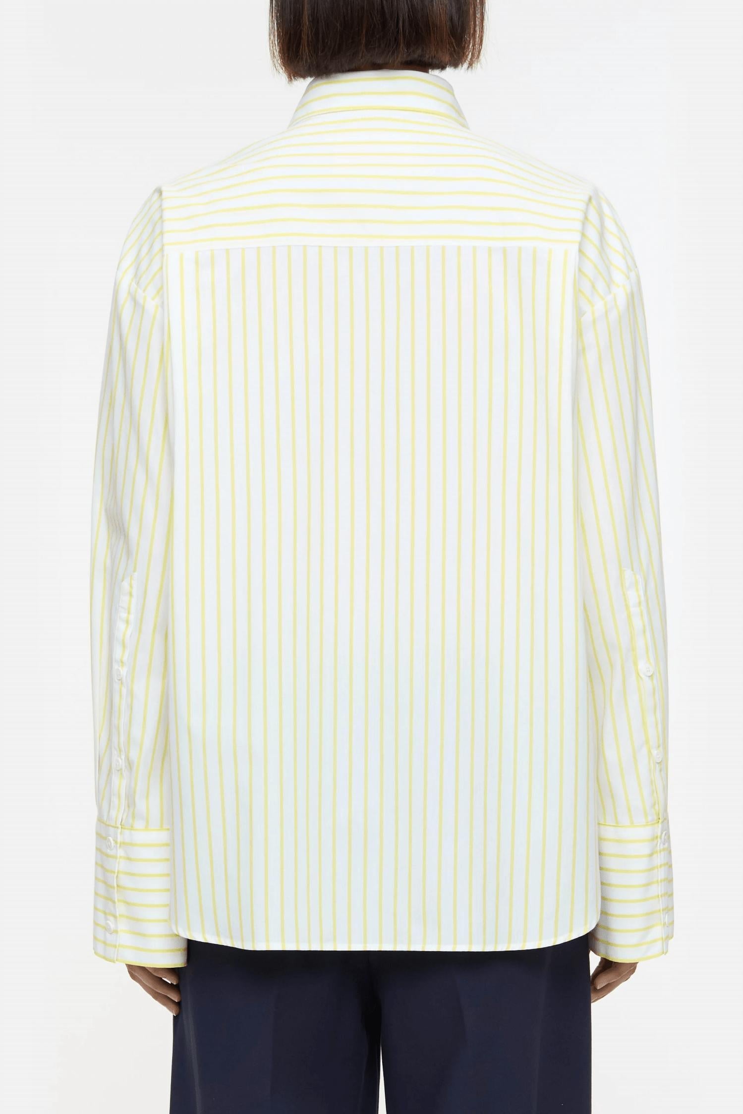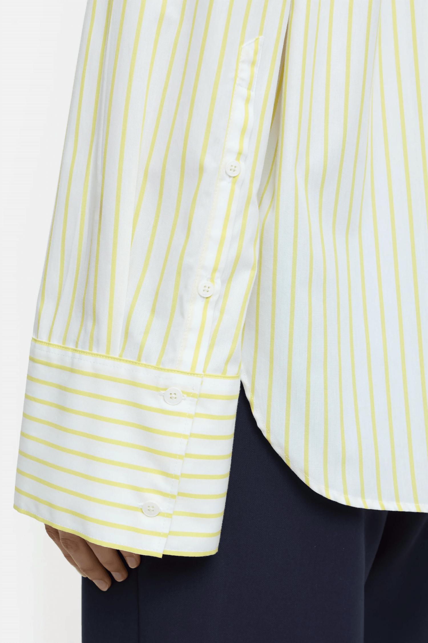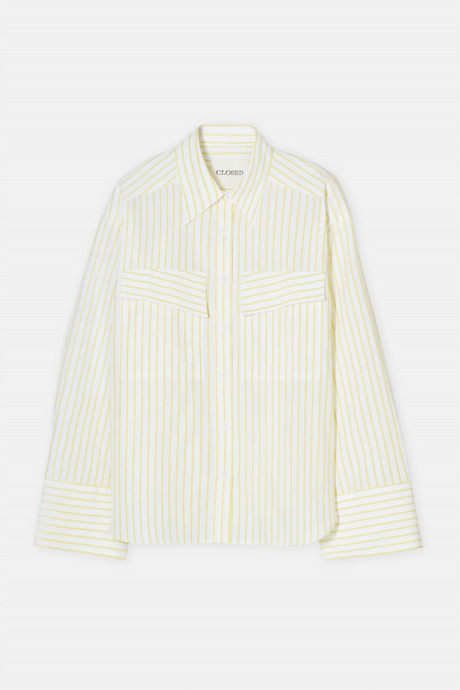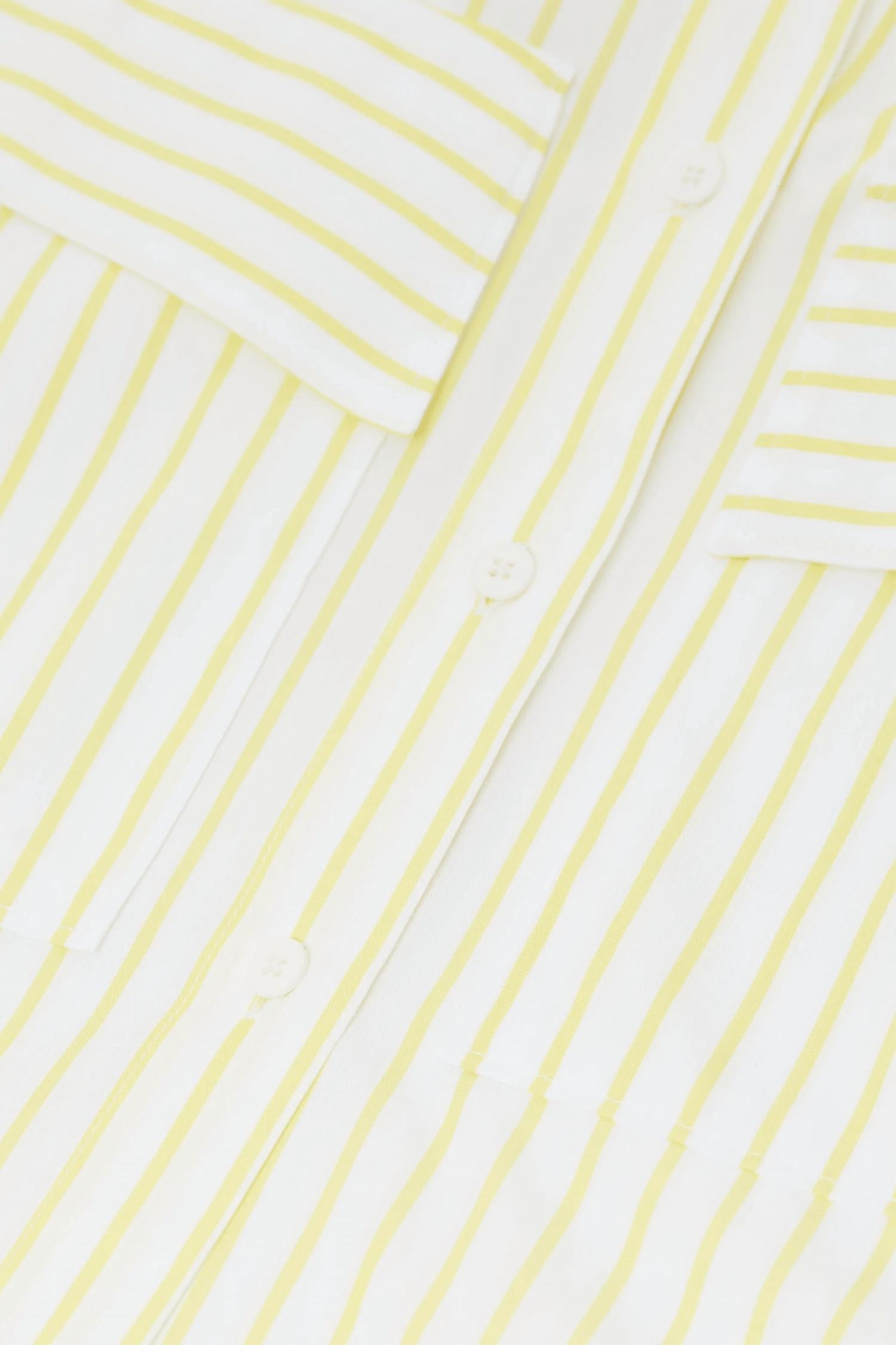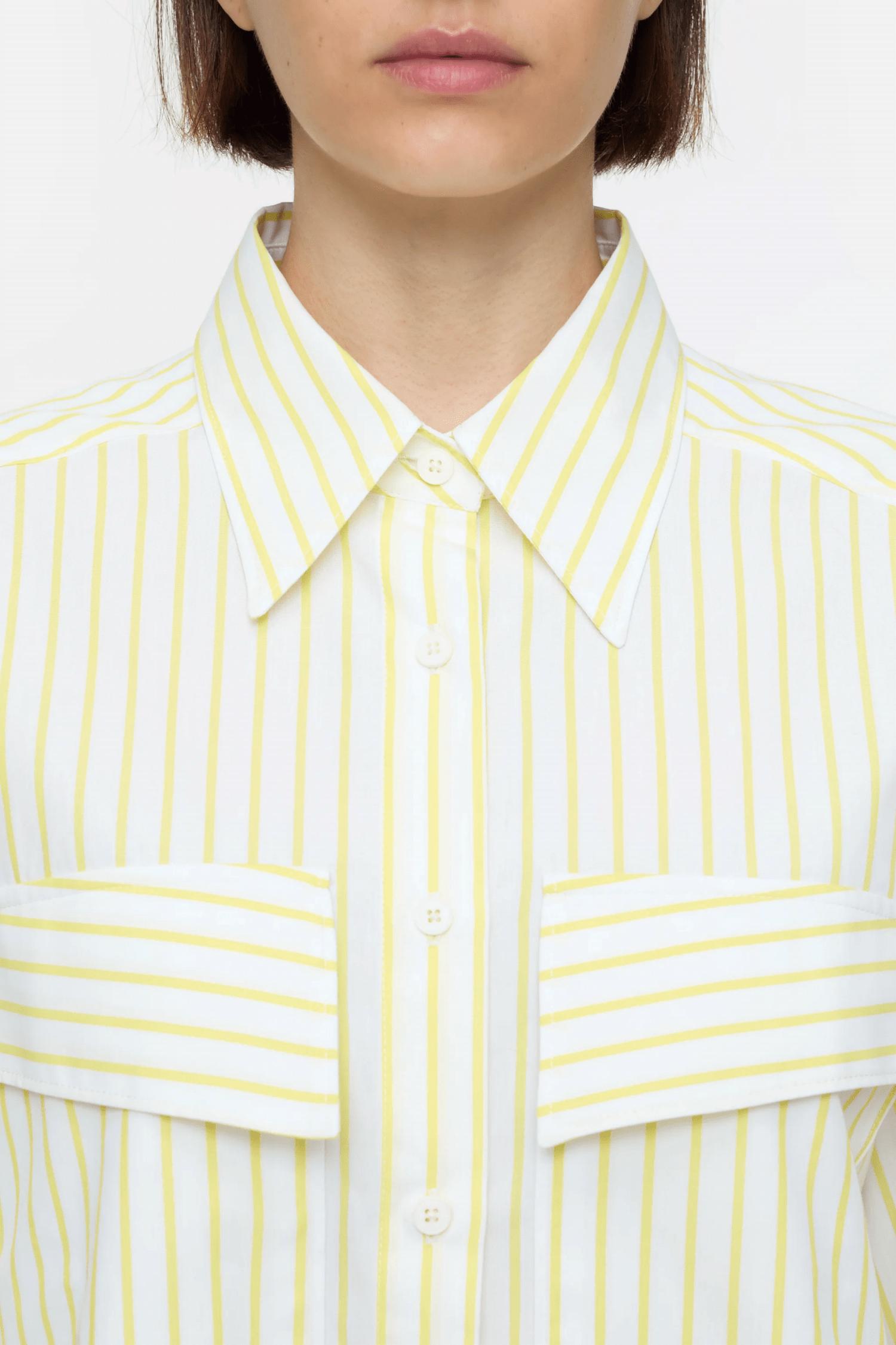 Perfectly tailored and soft to the touch. Introducing the CLOSED Utility Button Down Shirt in a refreshing Lemon Yellow, perfect for summer travels. This long sleeve shirt is crafted from 100% organic cotton in a Portuguese poplin fabric, showcasing a classic striped design. Featuring utility elements like large breast pockets, dropped shoulders, and a rounded hemline, it offers a relaxed fit at a length of 27.8 inches in size S. Made entirely in Portugal, this piece supports high-quality craftsmanship with a button closure and is easy to care for with machine wash instructions. Model is 5'8" and wearing a size S.
