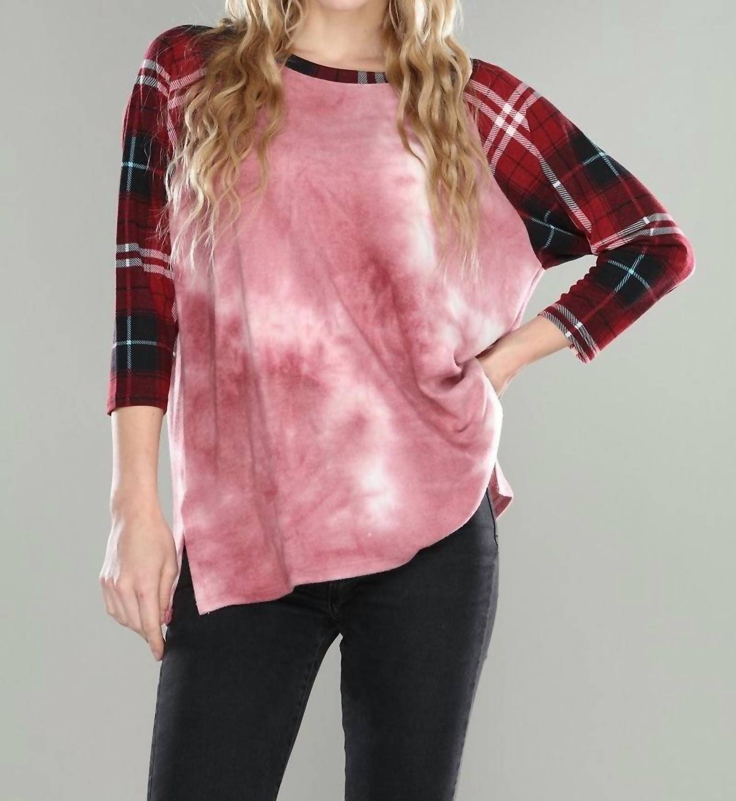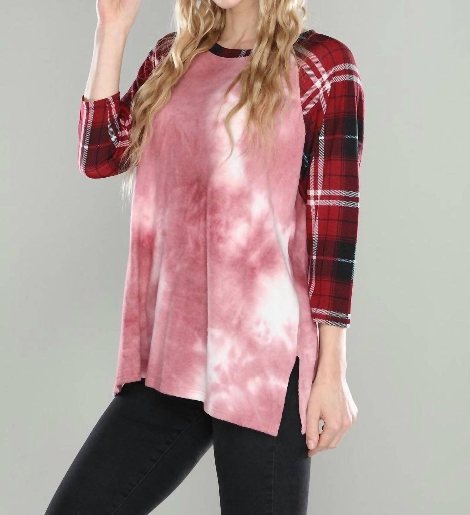 Introducing the Plaid Sleeve Fleece Jersey Tee by Crepas, a cozy addition to your spring wardrobe with a minimalist touch. This attractive top features three-quarter sleeves with a plaid and check pattern, perfectly complementing the super-soft tie dye fleece material. Its pull-on closure and versatile crewneck make it an easy choice for a relaxed vacation or a stylish Thanksgiving gathering. Ideal for women who appreciate comfort and style, this tee is a must-have for your casual wardrobe.