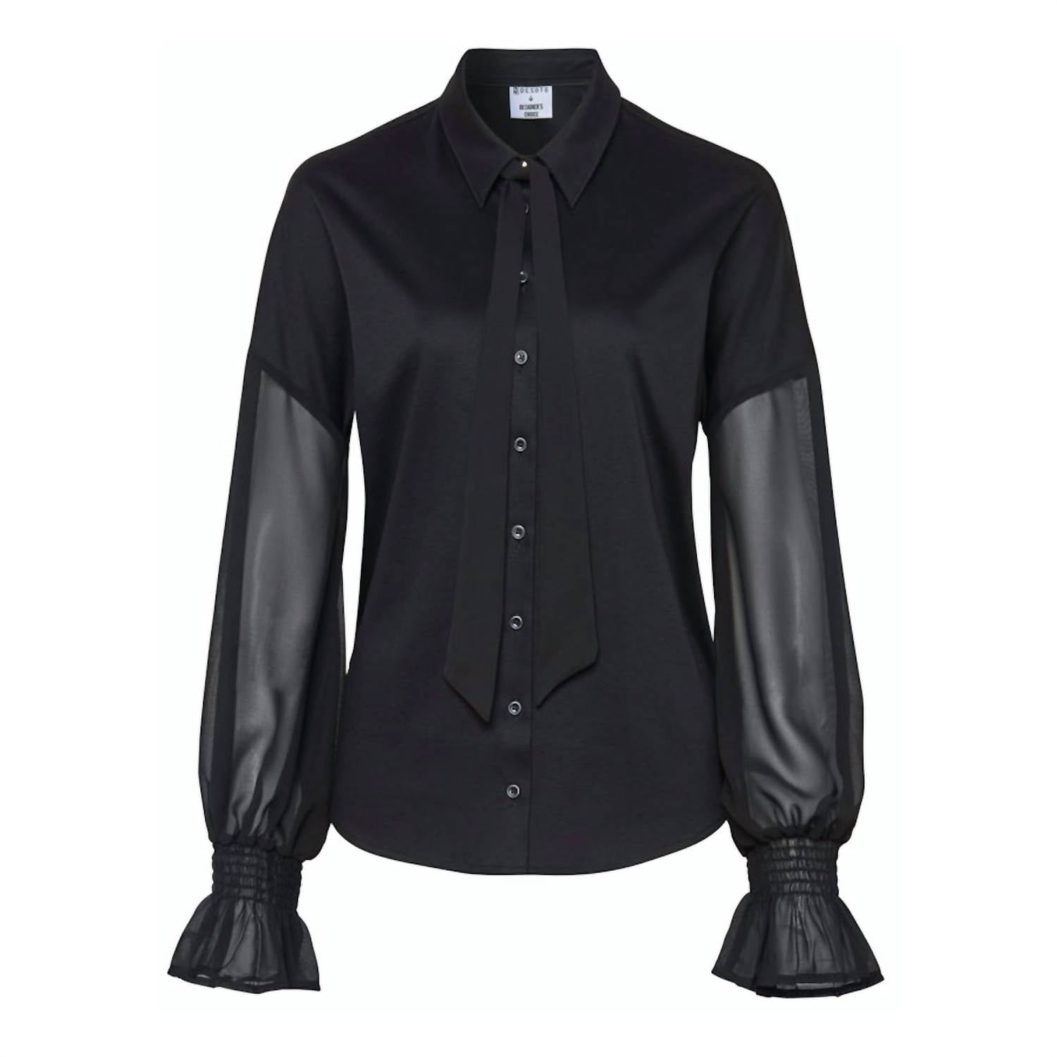 UP YOUR BLACK GAME WITH THE CLASSIC RUFFLE CUFF, BUTTON FRONT BLOUSE FROM DESOTO SHIRTS, IS A LUXURY ESSENTIAL MADE FOR YOUR WARDOBE. A MUST HAVE FOR JEANS, PANTS OR SKIRTS IN A BEAUTIFUL CONTEMPORARY STYLE WITH DROPPED SHOULDERS AND SHEER CHIFFON SLEEVES WITH ELASTIC SHIRRED CUFFS. ADDED REMOVABLE TIE. TAPERED FIT THAT'S LOOSE BUT NOT BAGGY.