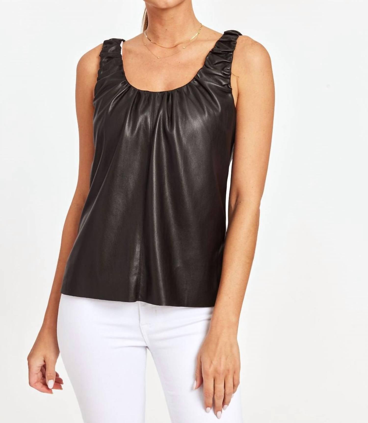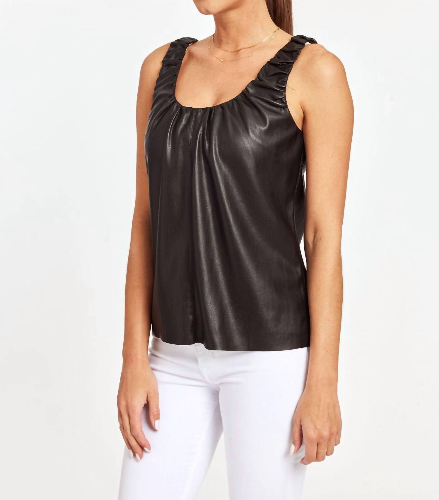 This classic tank top is perfect for layering and cute enough to wear on its own.Faux leather tank top. Unique gathered neckline. Sleek profile. Versatile for daytime or nighttime wear. Pair with jeans or skirts for a contemporary look. Also pairs well with flowy maxi skirts for a romantic vibe. 100% Nylon. Hand wash cold.