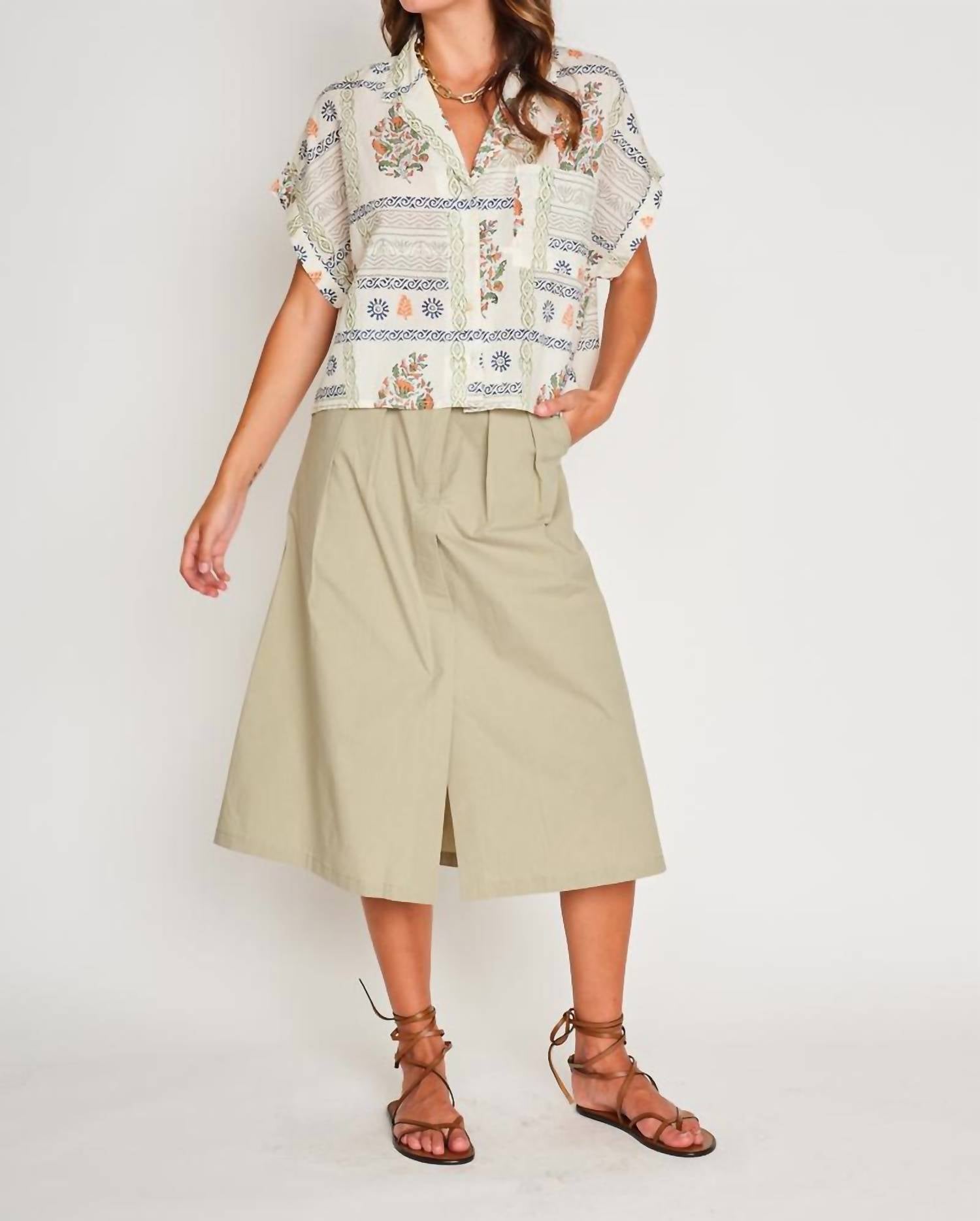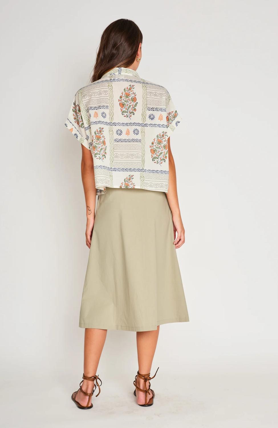 A versatile blouse that works from desk to dinner! Introducing the Aline Top by dRA Los Angeles, a playful piece perfect for your summer wardrobe. This patterned blouse in the Desert Tile print features short banded sleeves and a notched collar, offering a chic and youthful vibe with its high-hip hemline. Made from 100% cotton, it ensures comfort and breathability. Closure: Button closure. Care instructions: Hand wash cold, do not bleach, line dry, cool iron if needed.