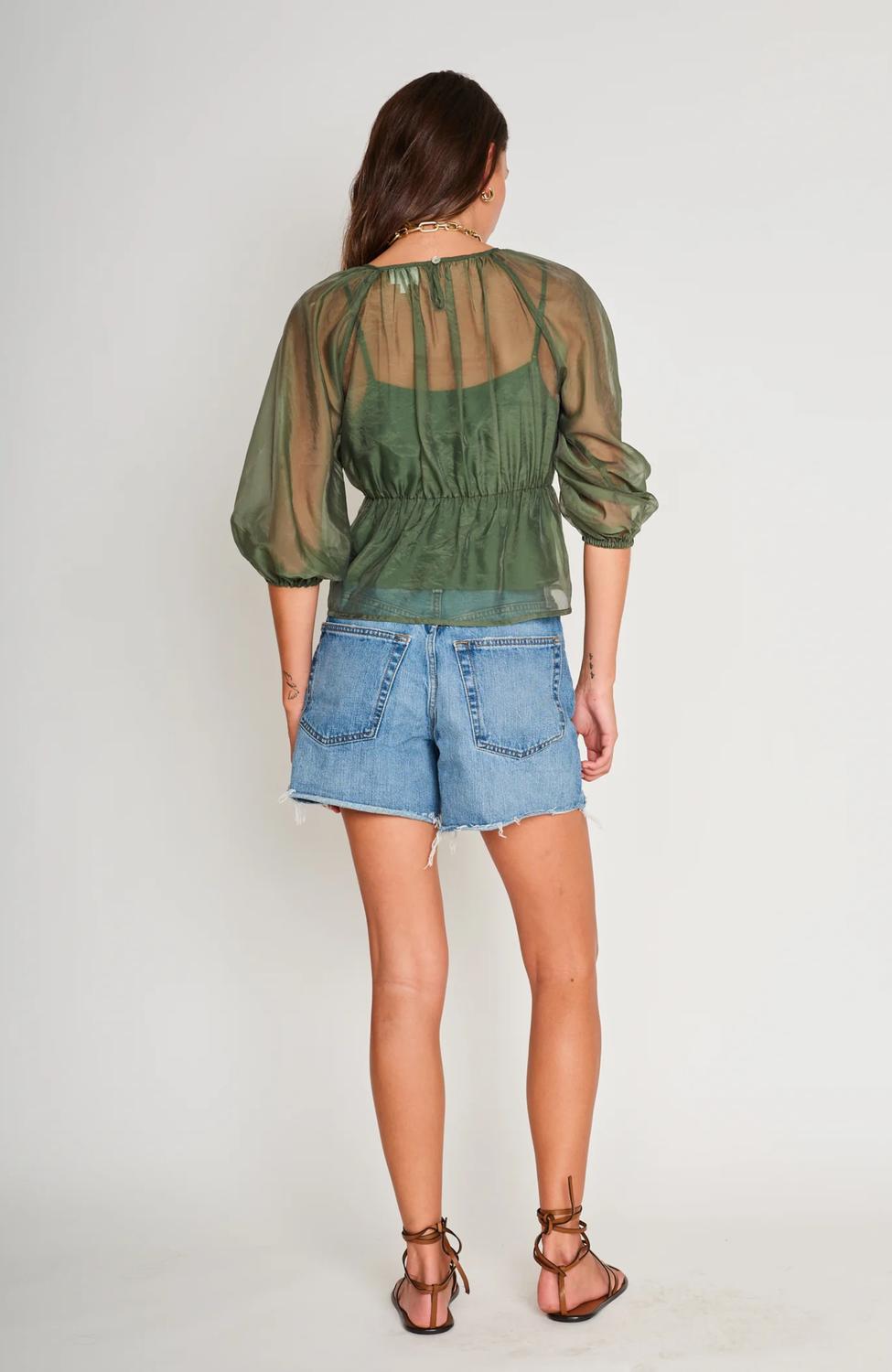 Pair this with your favorite jeans and slides for your next girls night out. Elevate your wardrobe with the Ella Top by dRA Los Angeles, featuring elegant three-quarter raglan puff sleeves and a flattering peplum silhouette. The textured Green organza brings sophistication to your look, making it perfect for a cocktail party or any special occasion. Material: Organza. Closure: Button closure.
