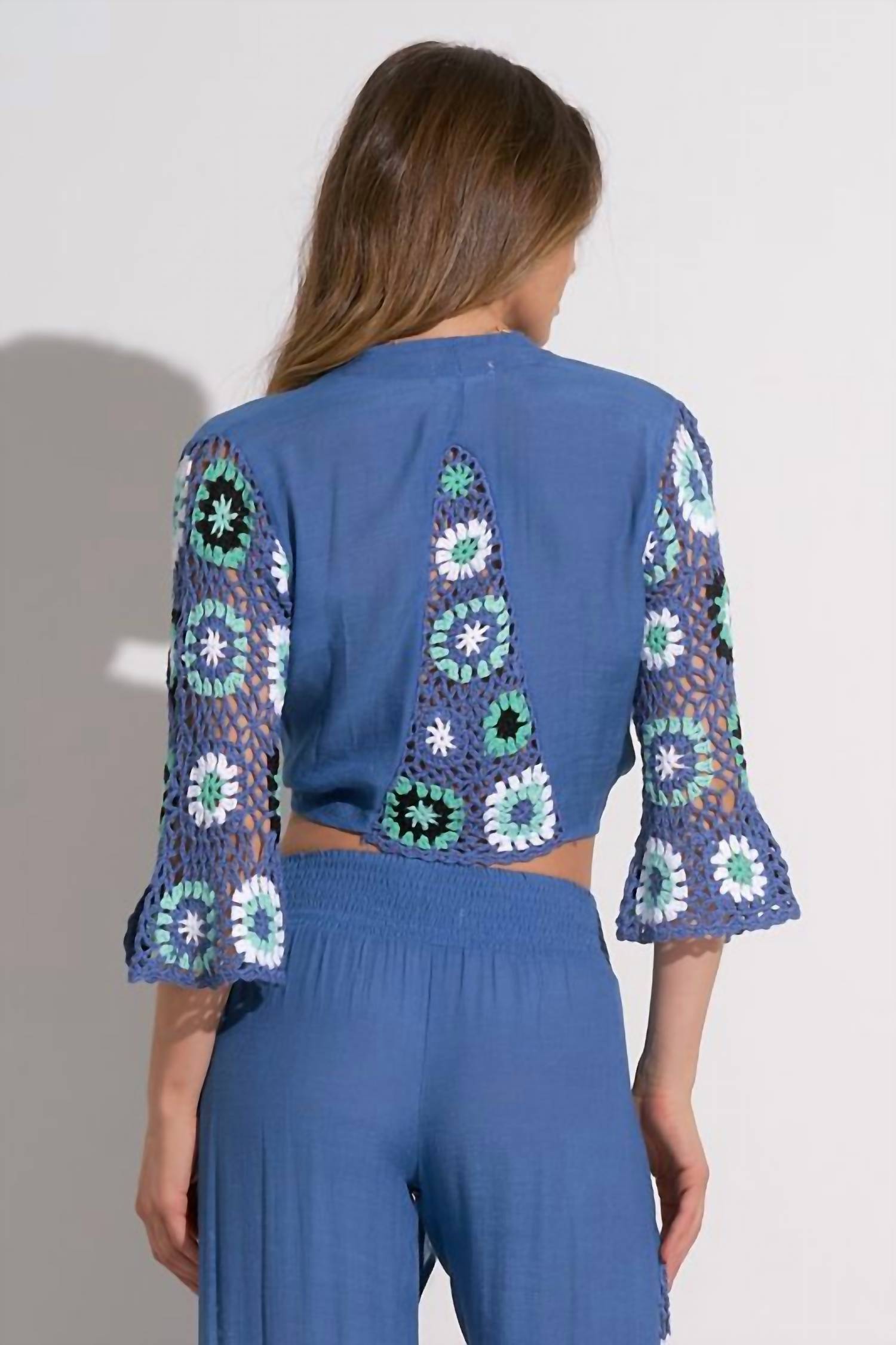 Pair this crop top with your favorite high-waisted jeans or maxi skirt. Unveiling the ELAN Palma Crochet Tie Top, a boho chic staple perfect for your beach day ensemble. Crafted with three-quarter sleeves, this patterned blue crop top is made from a blend of 50% Acrylic and 50% Viscose, offering both comfort and style. Featuring elegant crochet details and a v-neck with a tie closure, it is ideal for a versatile summer look. Care is simple with hand washing recommended to maintain its beautiful design.