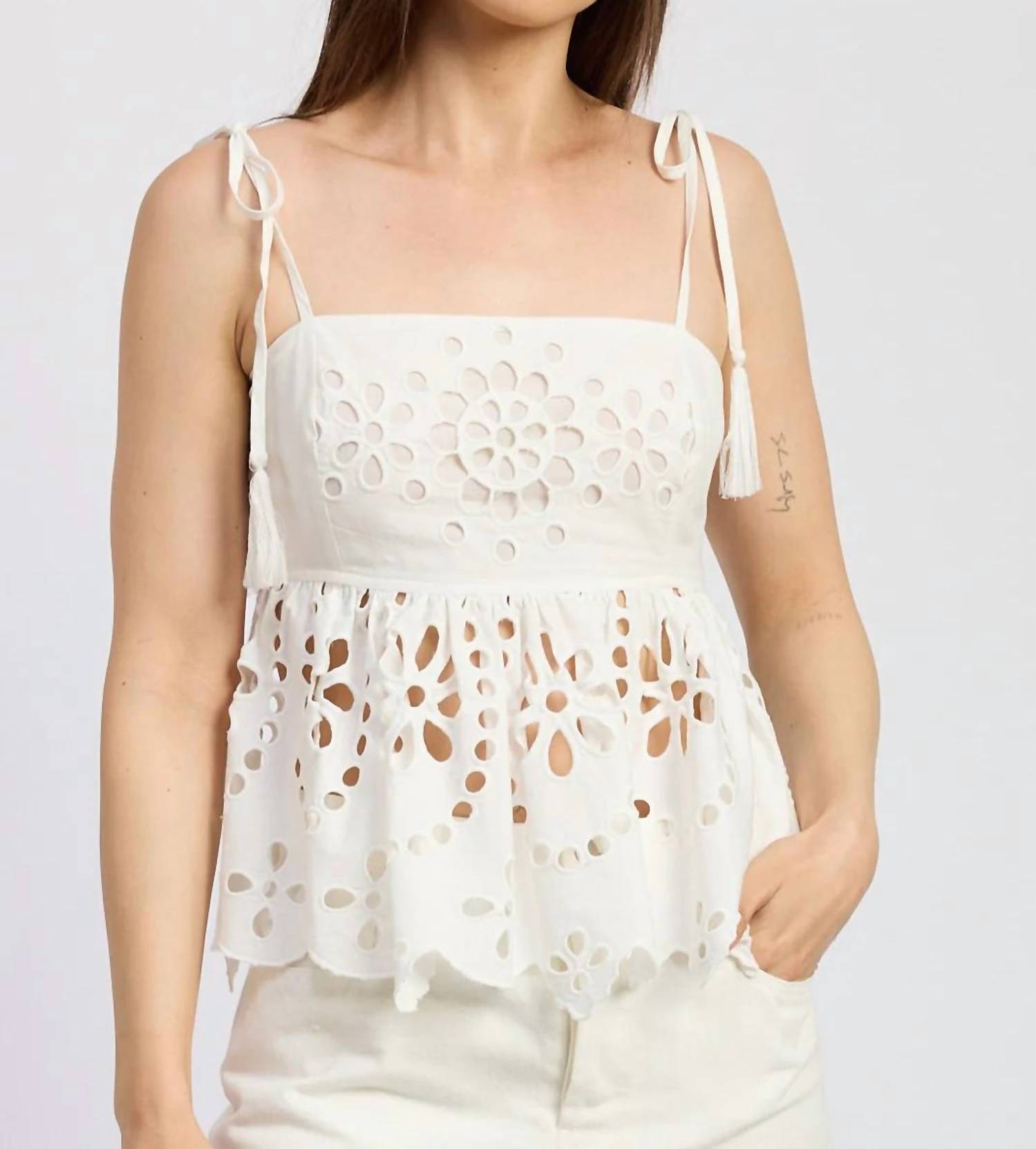Perfect for layering or cute enough to wear it on its own. Discover the Courtney Top by En Saison, a statement piece perfect for your next dinner party or 4th of July gathering. This sleeveless babydoll peplum top features a playful tie closure at the shoulder, complemented by exquisite placed embroidery and a squareneck design. Made from 100% cotton, the textured fabric adds a touch of maximalist charm. Crafted for spring, this imported top should be hand washed to maintain its pristine condition.