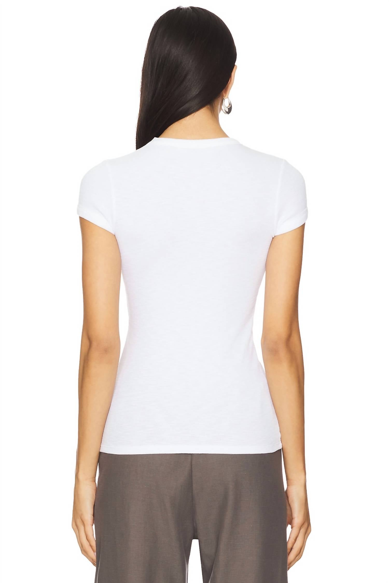 Introducing the Textured Rib Cap Sleeve Crew Shirt by Enza Costa in a crisp white hue, perfect for effortless styling. This women's tee features cap sleeves and is crafted from a soft cotton blend, ensuring comfort and a flattering fit with its classic crew neckline. Proudly made in the USA, it offers a solid, timeless look with a pull-on closure. To maintain its quality, hand wash this garment with care. 97% Cotton 3% Lycra.