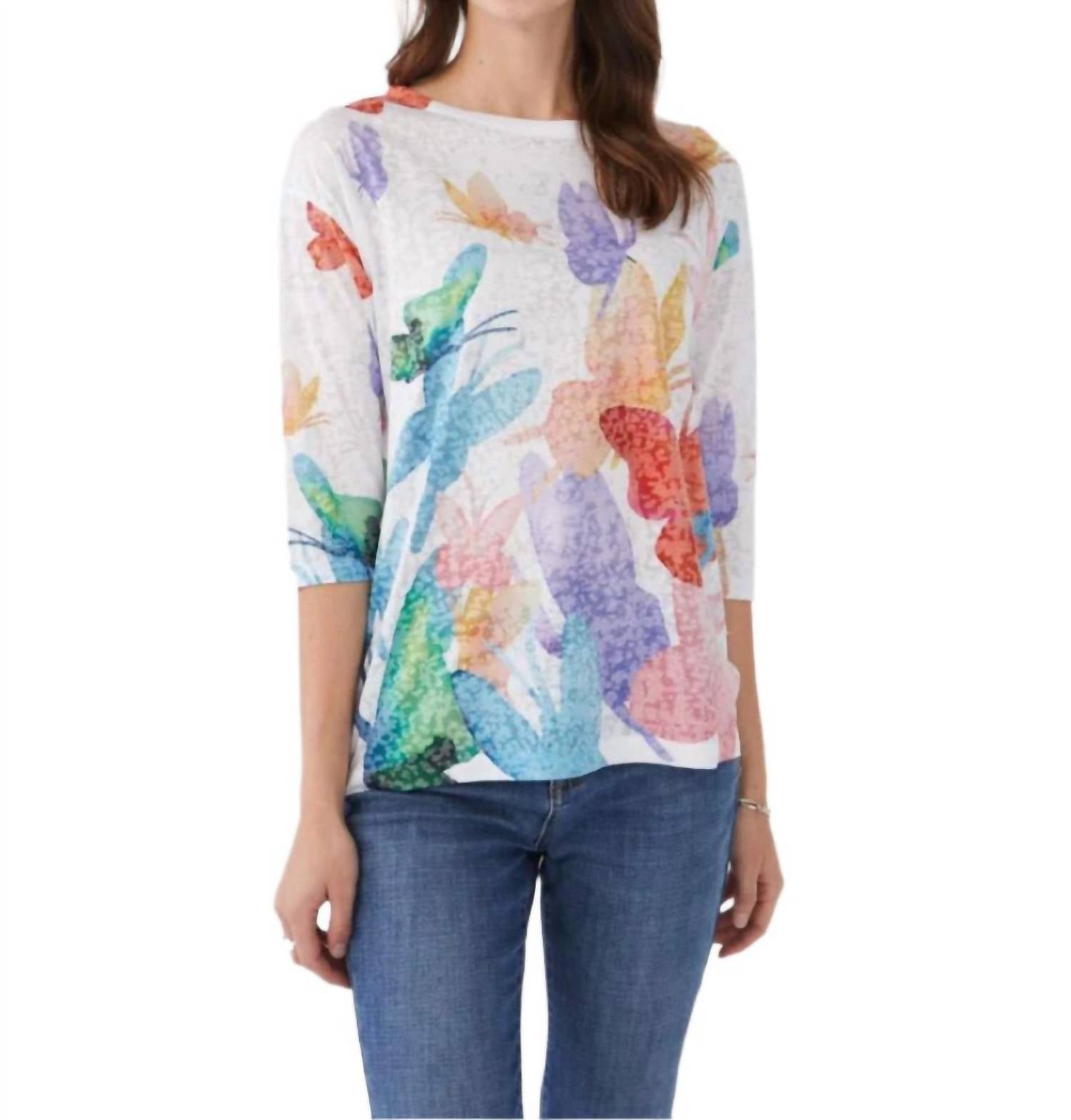 Pair this with your favorite jeans and slides for your next girls night out. Introducing the Cascading Butterflies Top by FDJ, a vibrant piece perfect for any occasion. This blouse showcases a unique boatneck and three-quarter sleeves, adorned with a colorful butterfly pattern that captures attention. Designed for vacation-ready style, it features a convenient pull-on closure. Embrace your fun side in this multi-colored masterpiece made for the spring season.