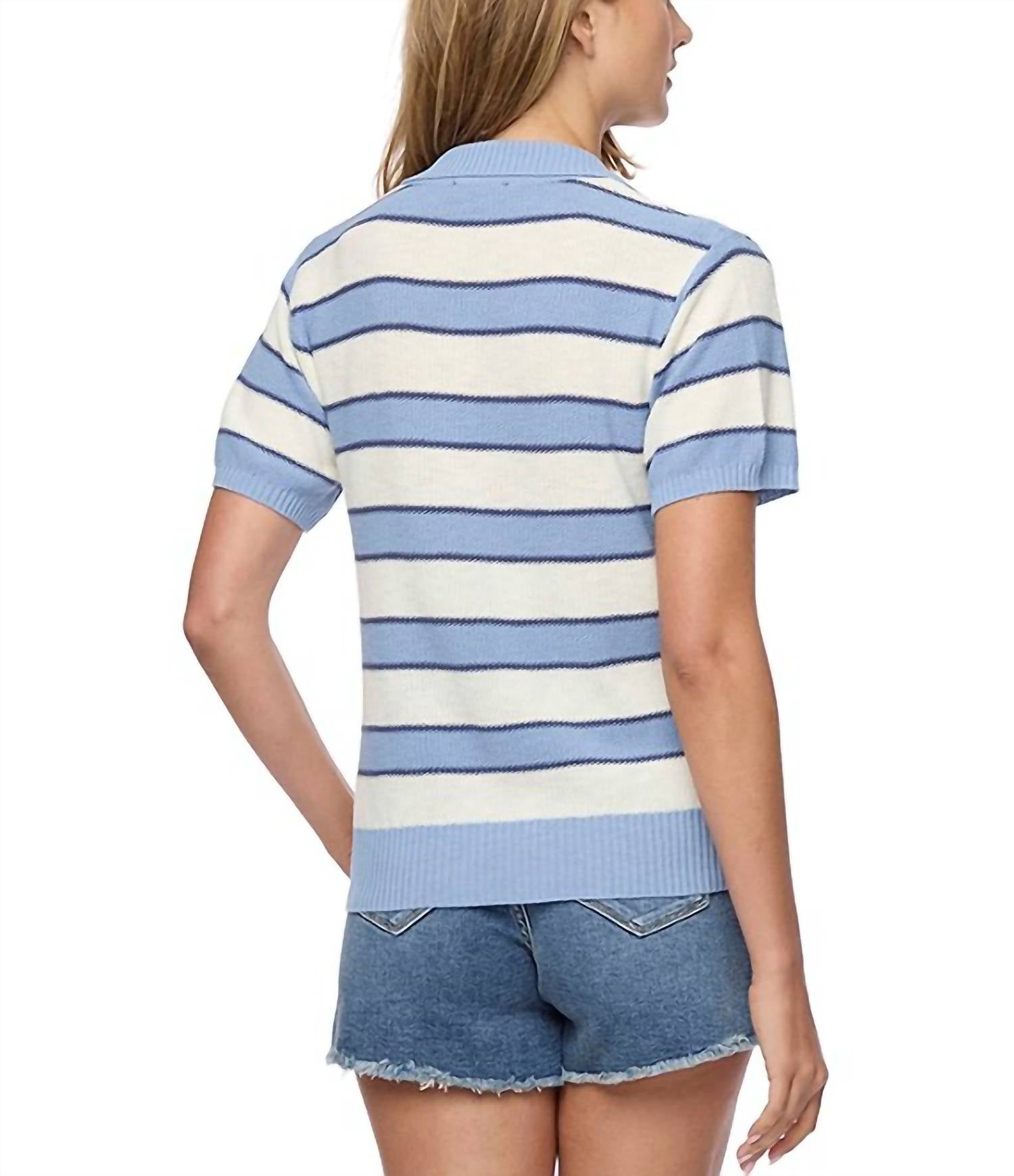 The Maben Striped Short Sleeve Sweater Polo Shirt by Flags & Anthem is a stylish addition to any wardrobe, featuring a classic striped pattern in cream and blue. With a relaxed fit, short sleeves, a johnny collar, and practical rib-knit cuffs and hem, it offers both comfort and elegance. The top includes a front patch pocket for added convenience and measures 21.5 inches in length. Made from a lightweight cotton blend, this polo is imported and easy to care for with machine wash and line dry instructions, making it ideal for summer travel and preppy style.