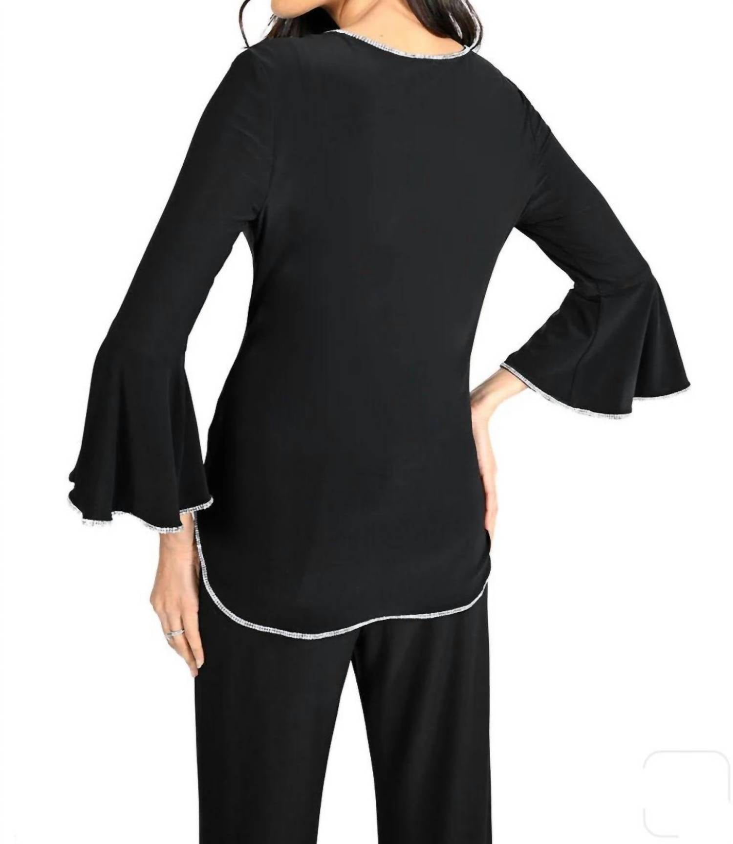 Add a touch of elegance to your wardrobe with the Frank Lyman Bianca Bell Three Quarter Sleeve Top. Crafted for a sophisticated look, this top features a sleek black design with dazzling rhinestone embellishments at the bottom hem, neckline, and bell sleeves. Made from 92% Polyester and 8% Elastane, it offers a flattering fit perfect for any evening event. Closure: Pull on. Care: Hand wash cold and line dry, do not bleach.