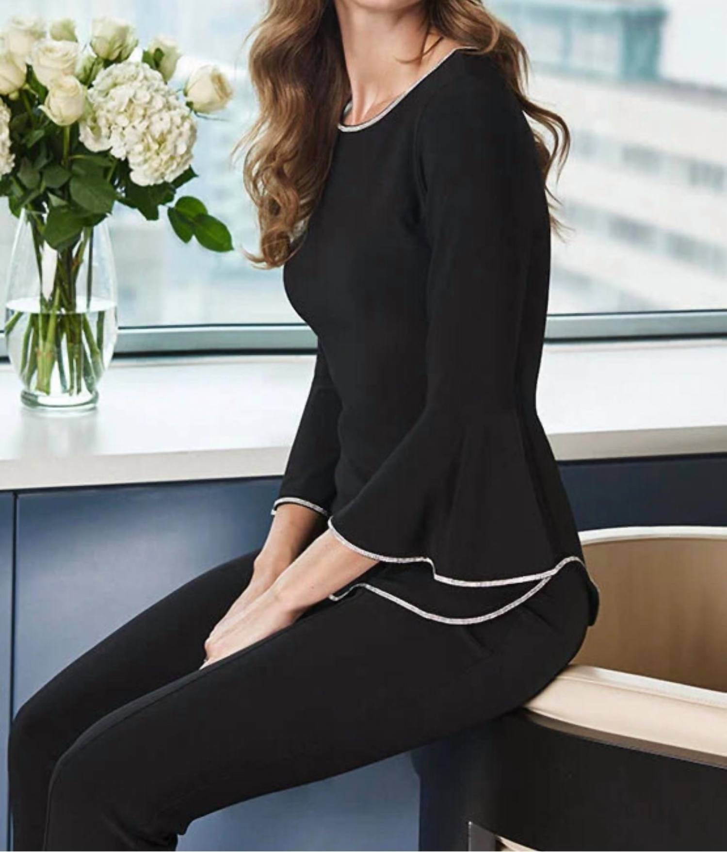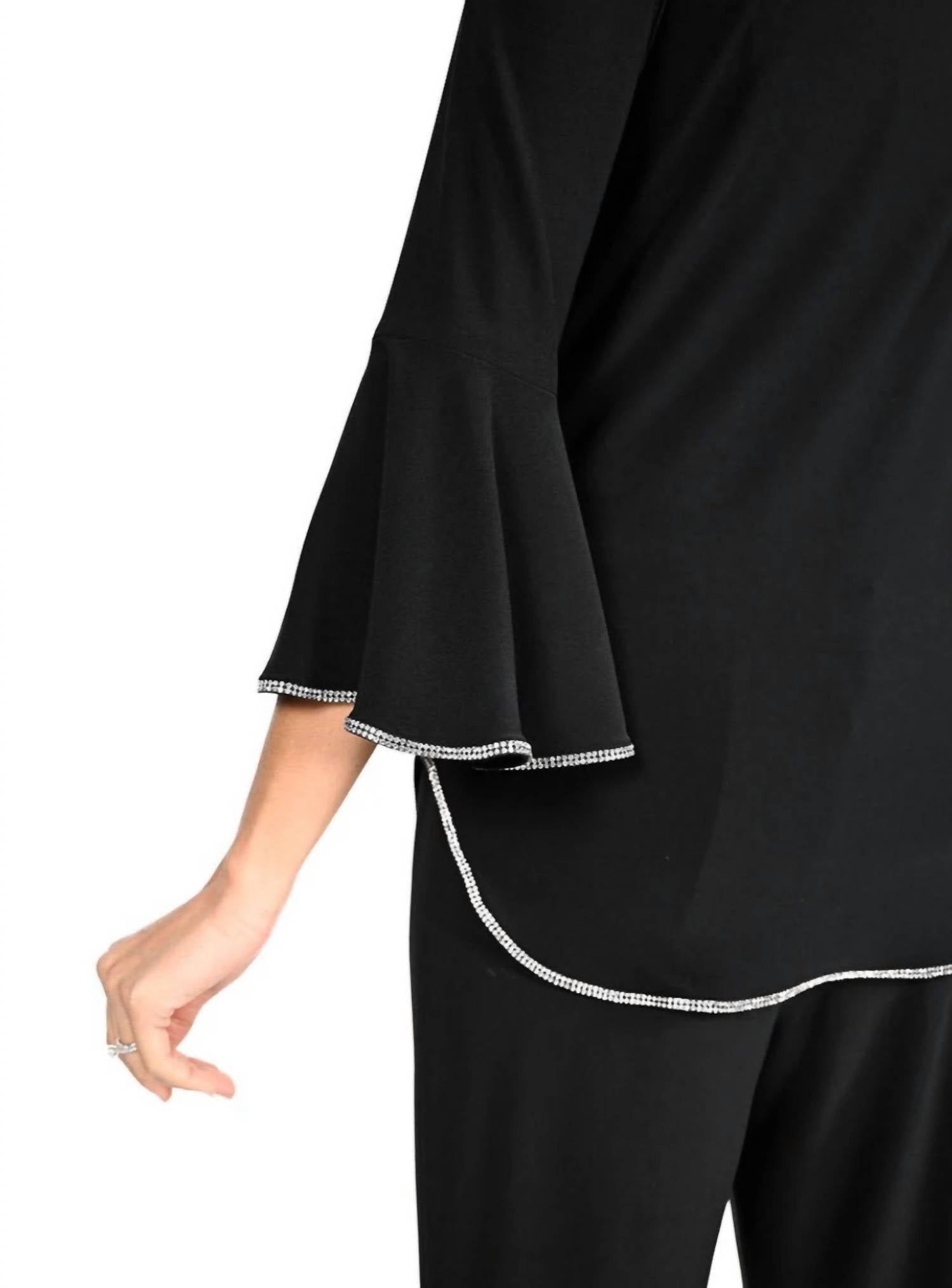 Pair this with your favorite jeans and slides for your next girls night out. Add a touch of elegance to your wardrobe with the Frank Lyman Bianca Bell Three Quarter Sleeve Top. Crafted for a sophisticated look, this top features a sleek black design with dazzling rhinestone embellishments at the bottom hem, neckline, and bell sleeves. Made from 92% Polyester and 8% Elastane, it offers a flattering fit perfect for any evening event. Closure: Pull on. Care: Hand wash cold and line dry, do not bleach.