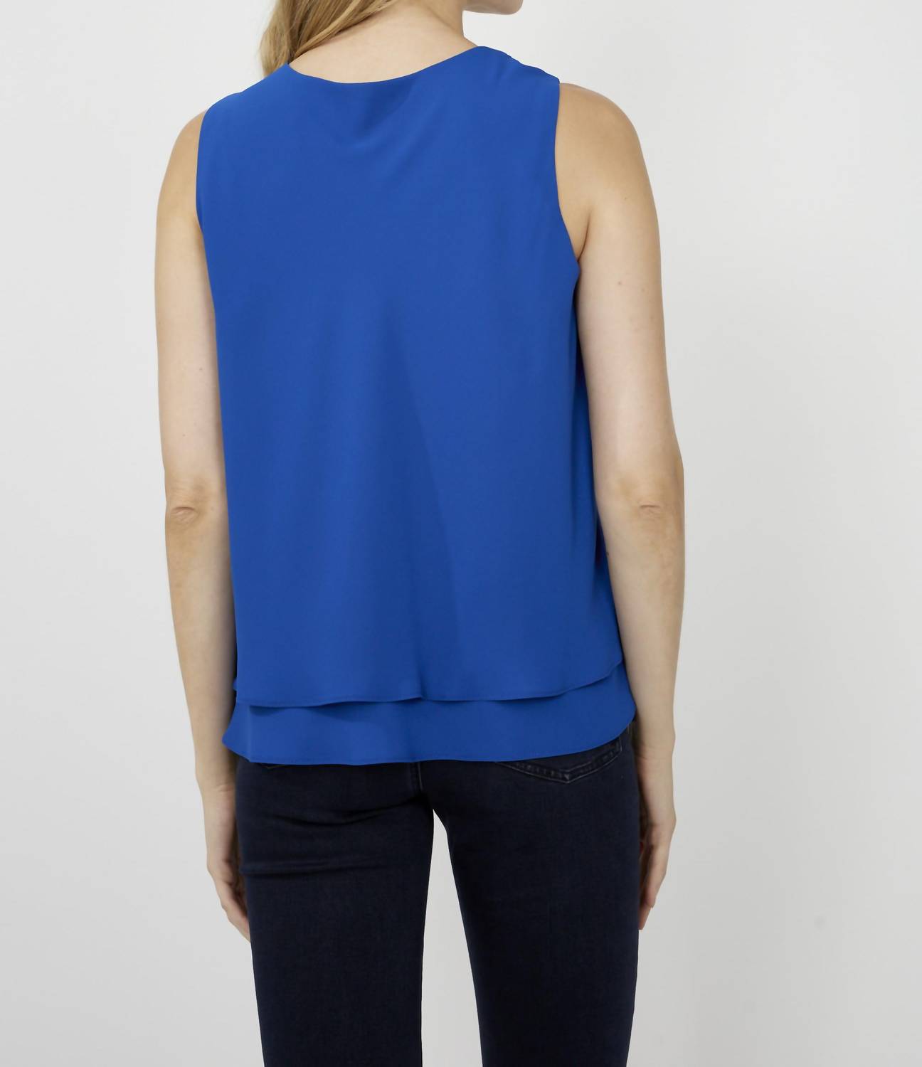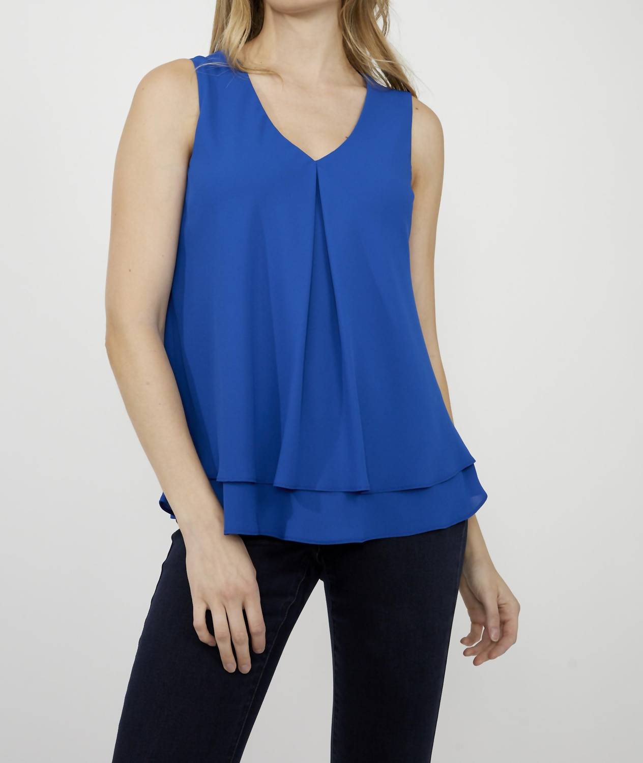 Introducing the Sleeveless V-neck Pullover Top by Frank Lyman, a sophisticated addition to any wardrobe in a stunning blue hue. Crafted from 100% Polyester, this solid patterned top features a stylish V-neckline and layered design, perfect for cocktail parties or casual events alike. Closure: Pull On. Ideal for spring occasions, prepare to turn heads with its sleek, effortless elegance.