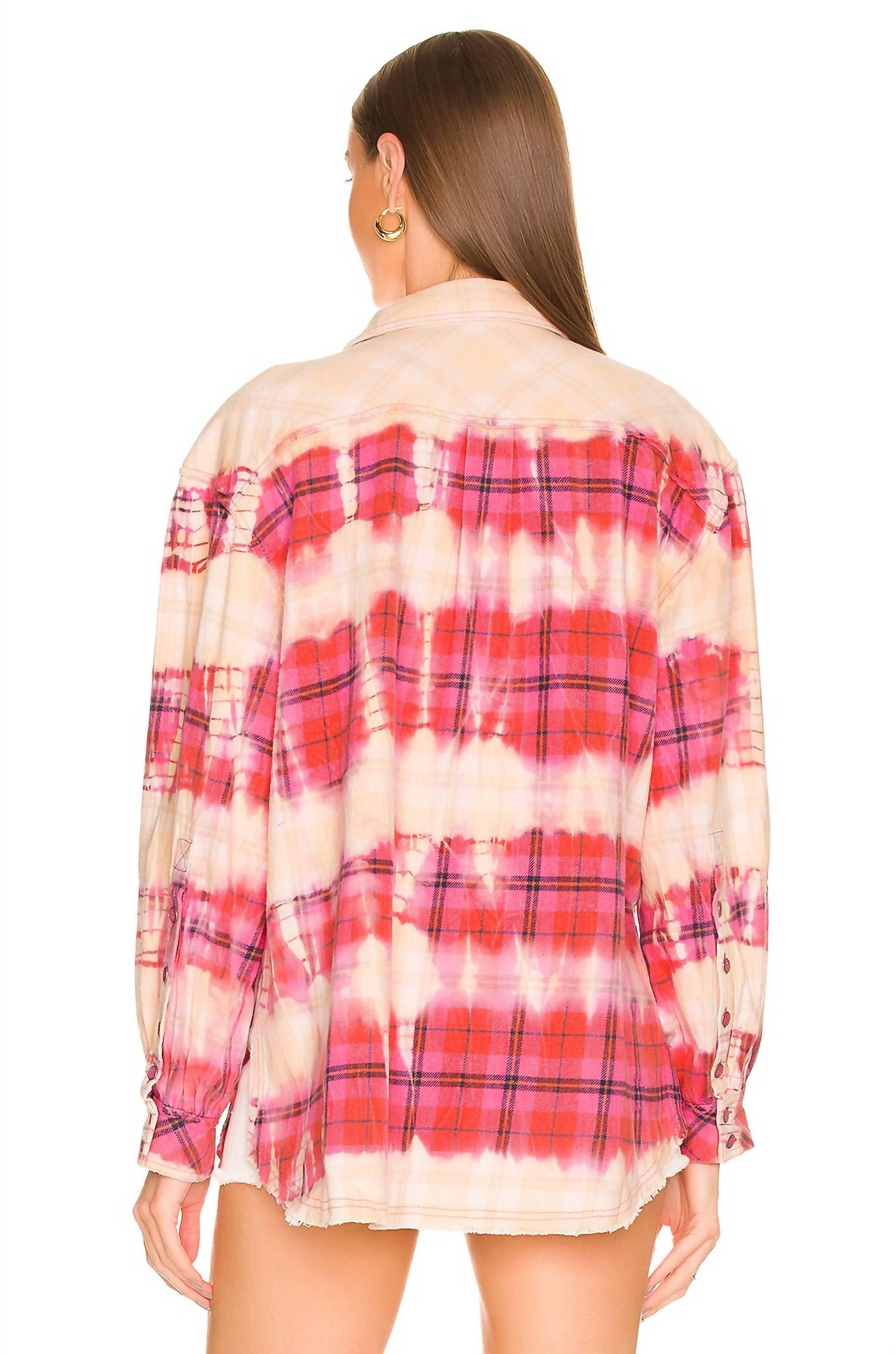 Perfectly tailored and soft to the touch. Stylish choice for your travel wardrobe in Pink Rose. Button-down shirt features long sleeves, a classic collar, and a playful tie-dye plaid print for a lived-in aesthetic. Composition details add to its timeless wearability, complemented by a bust patch pocket and a raw-edged bottom hem. Garment Length: 30 inches. Button Closure. Machine wash cold. Measurements for size small: Bust 47 inches, Sleeve Length 22 inches.